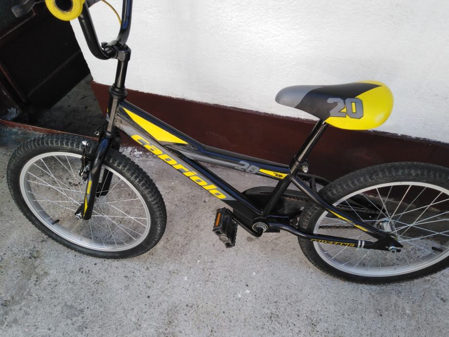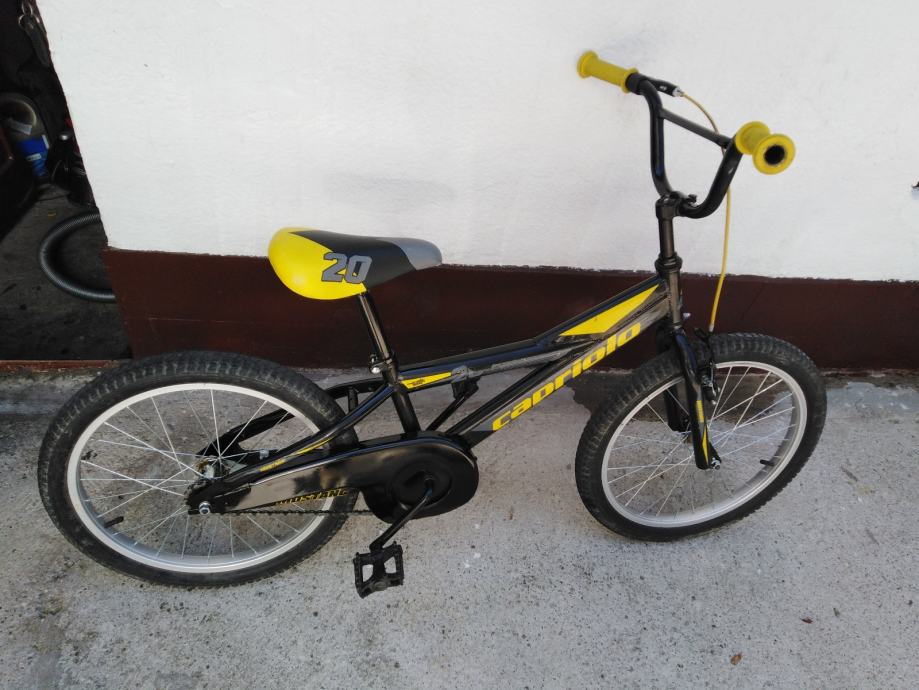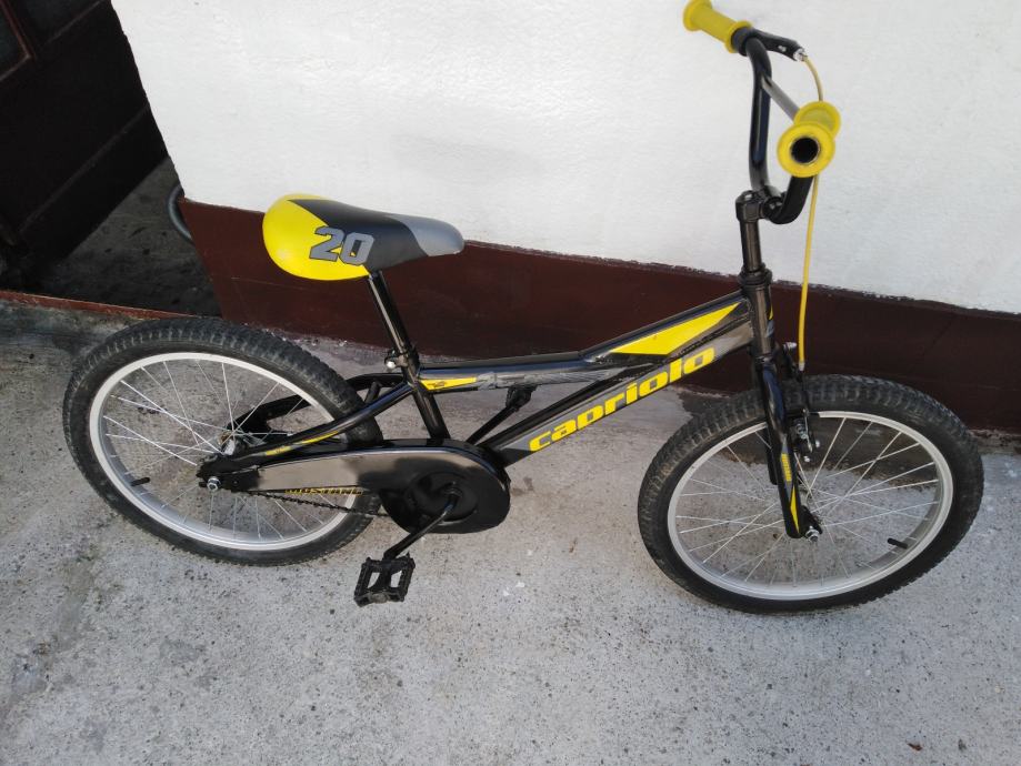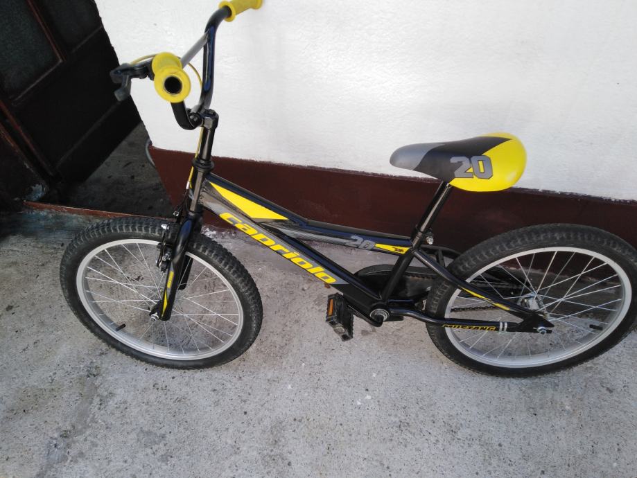 Prodajem rabljeni dječji bicikl Capriolo Mustang s kotačima od 20 inča. Bicikl je u crno-žutoj boji, idealan za djecu školske dobi. Konstrukcija je čvrsta i pouzdana, savršena za male vozače koji žele istražiti svijet na dva kotača.