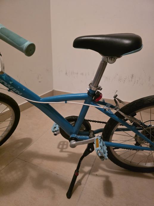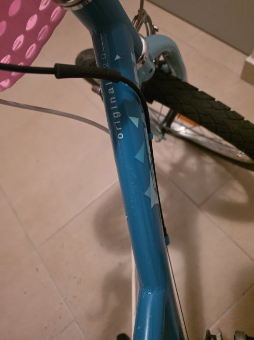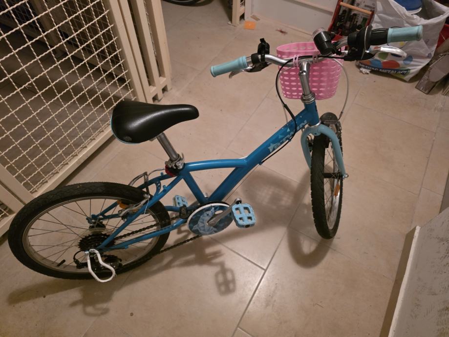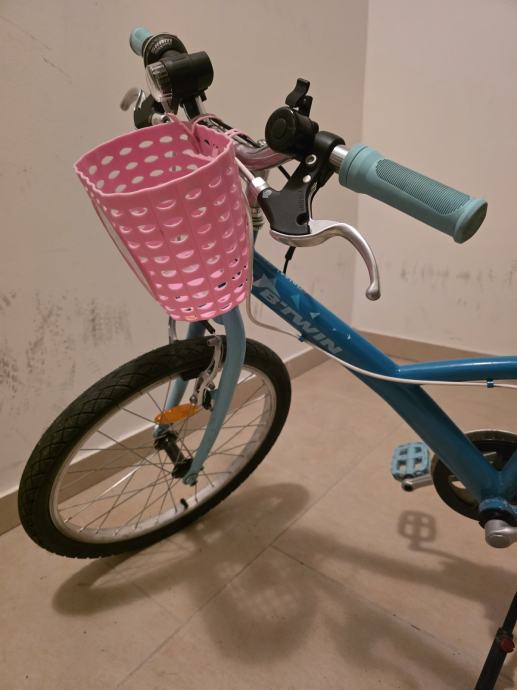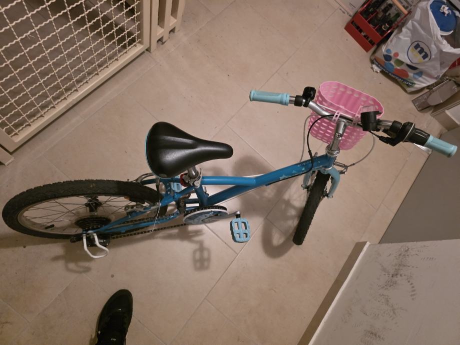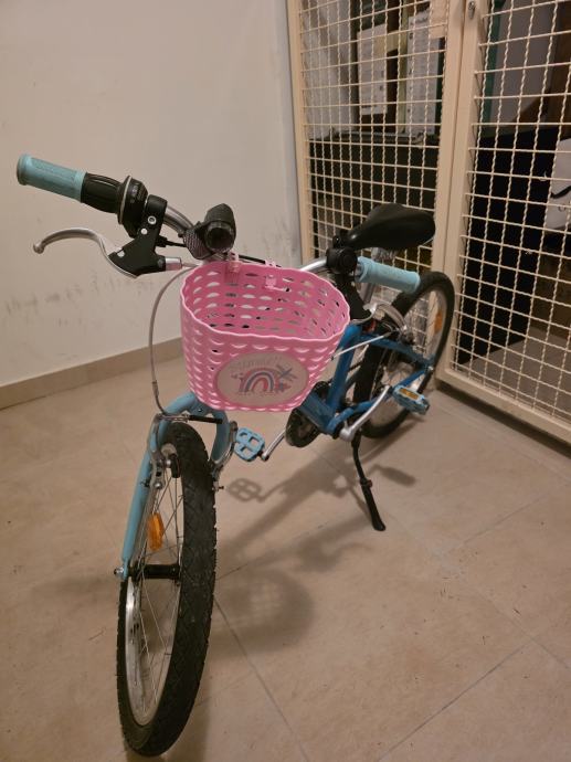 Djecji bicikl tirkizno plave boje, moze biti i za curicu i za decka. Kod bas ga je vozila curica pa smo dodali rozu kosaru