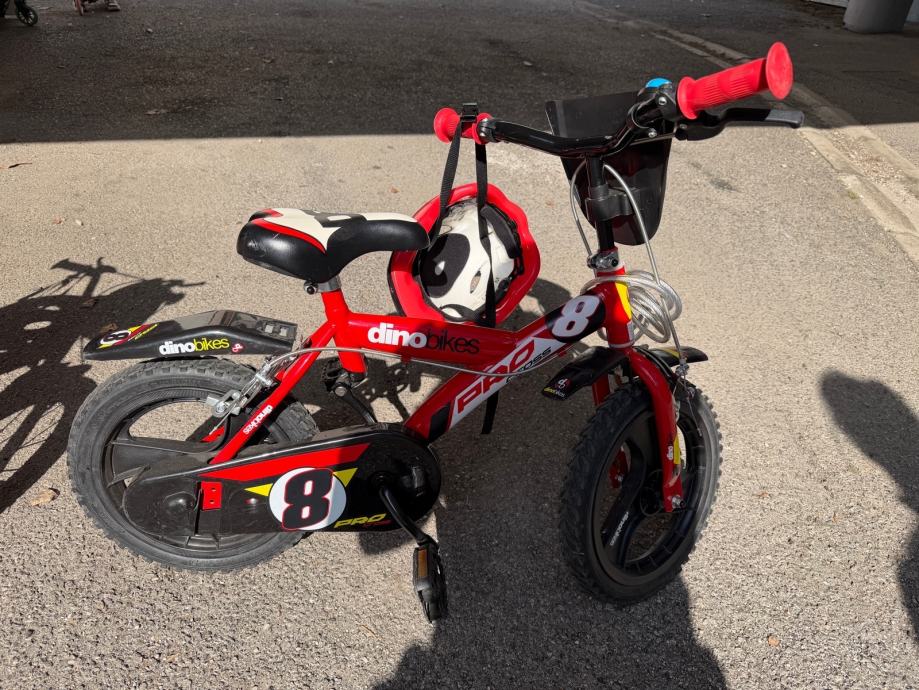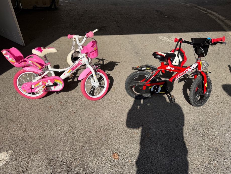 Prodajem kao nove bicikle Dino bikes 14 cola. Svaki sa slike 60,00 €. Bicikli servisirani, kočnice i gume ispravne. Očuvani jer se polagao uvijek na nogar. Bicikle imaju i pomoćne korače koji se nikad nisu koristili. Poklon kacige sa motivima u skladu s biciklom, zvonce i nogari. Osobno preuzimanje Zagreb - zapad.