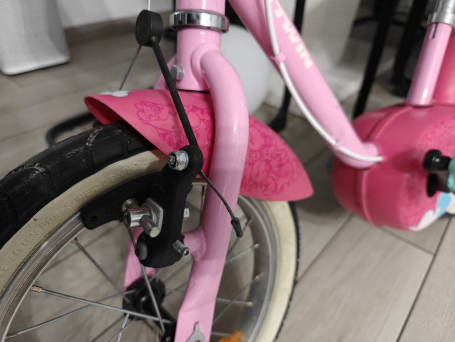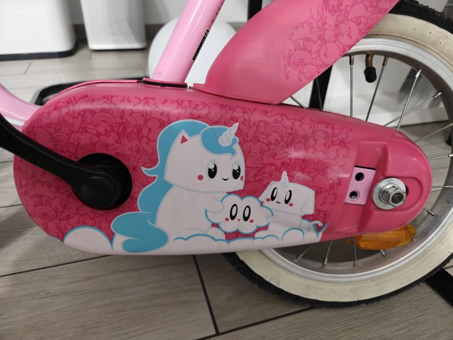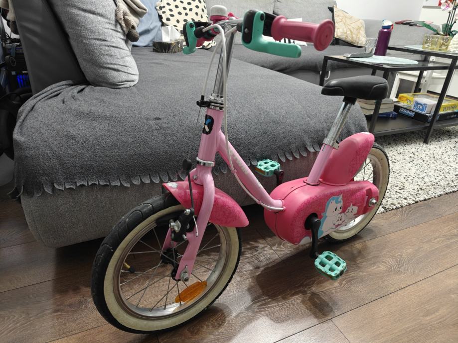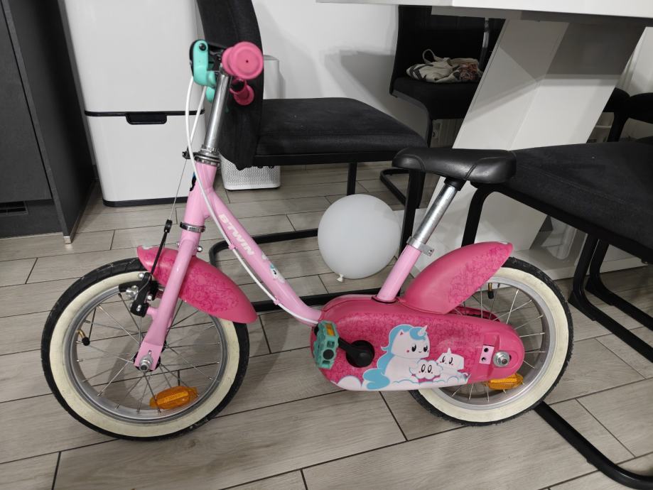 Bicikl iz decathlona s 14 inčnim kotačima za djevojčice 3-5 godina. U odličnom stanju i ispravan. Jako malo vožen. Dolazi s pomoćnim kotačićima.