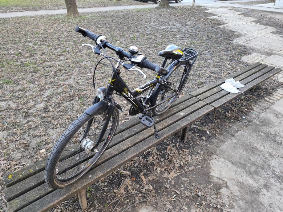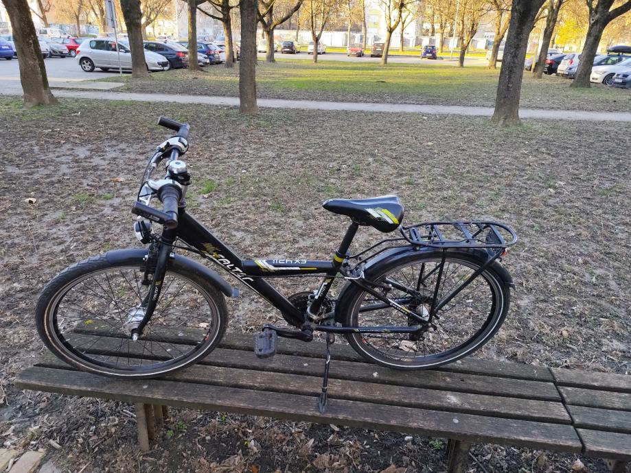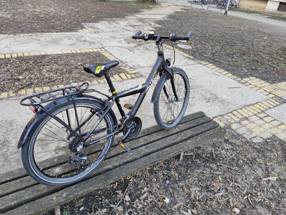 Prodajem dječji bicikl Falter s kotačima veličine 24 inča, aluminijska rama. Bicikl je crne boje s žutim detaljima, opremljen mjenjačem brzina, stražnjim prtljažnikom i blatobranima. Upravljač i sjedalo su podesivi po visini.