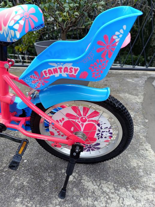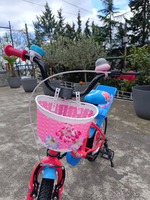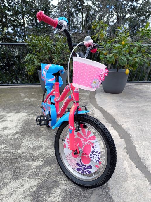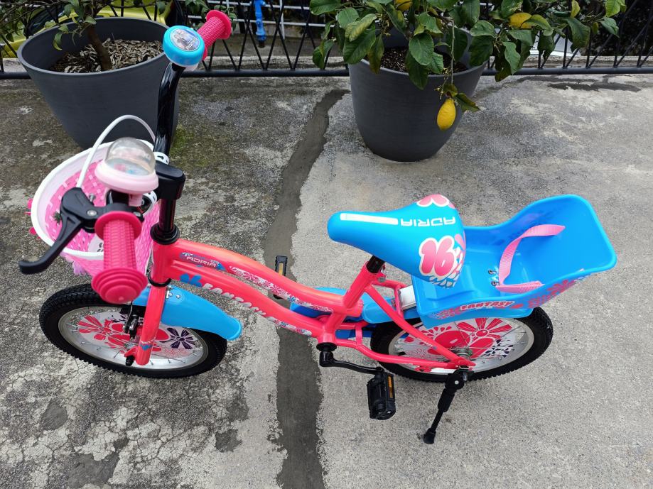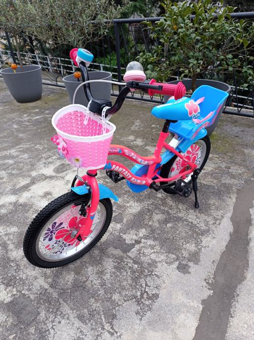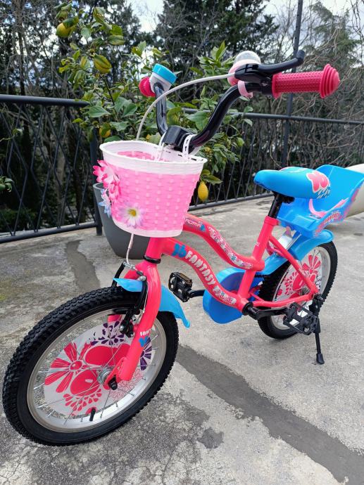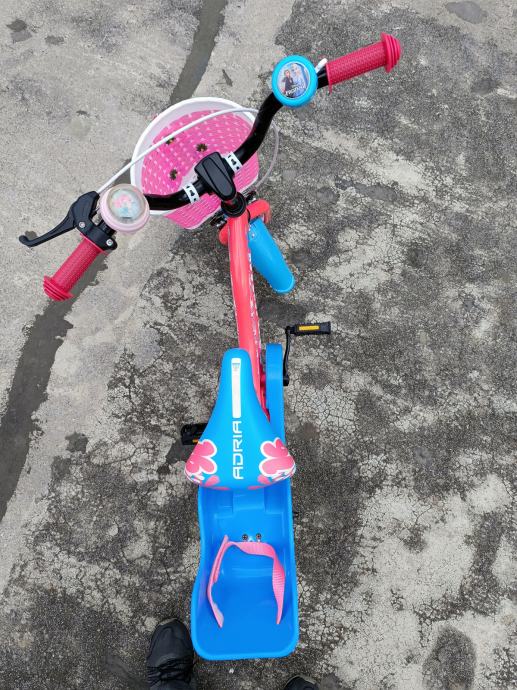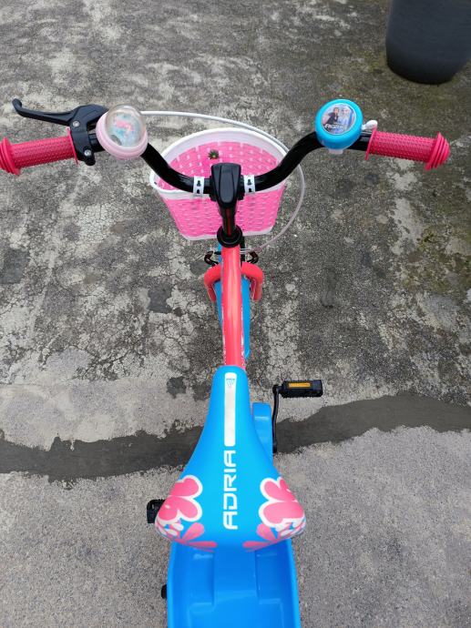 Prodajem dječji bicikl ADRIA Fantasy 16". Prednja kočnica V-brake, zadnja kočnica na pedali, ima i pomoćne kotače. Dodatno stavljena nogara i zvonca.