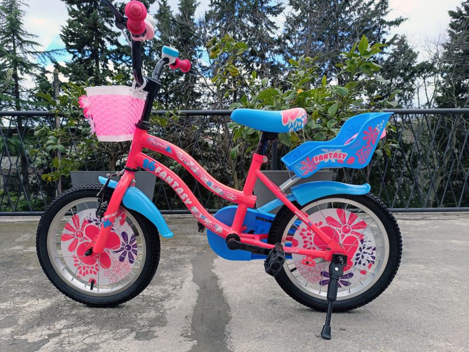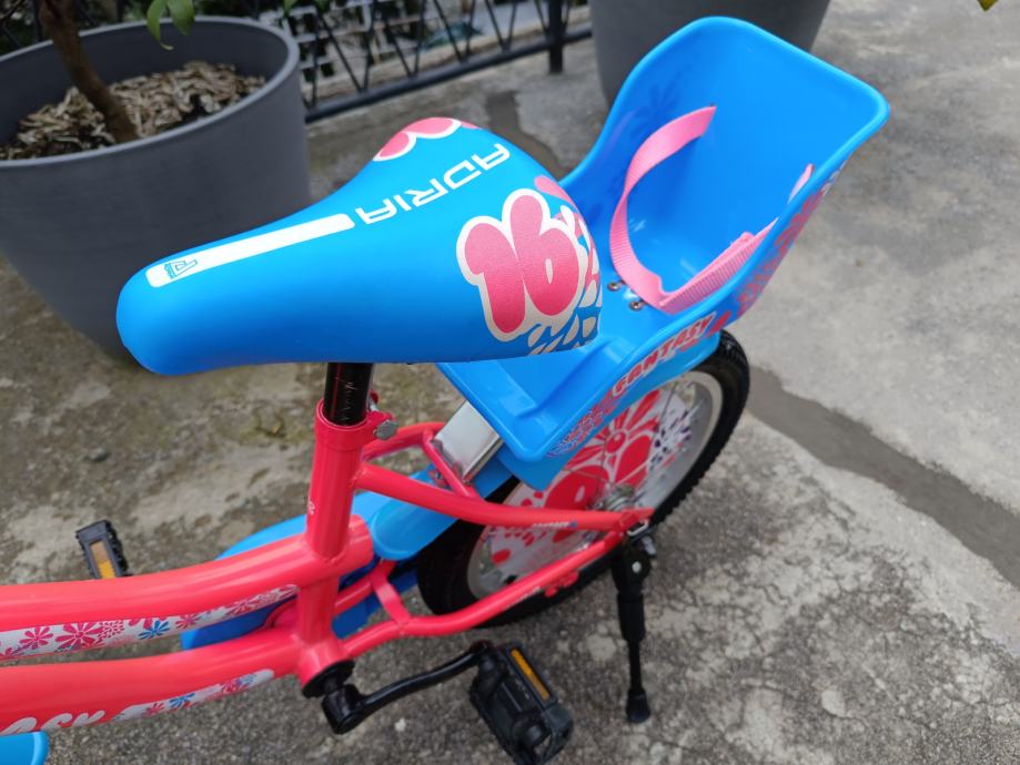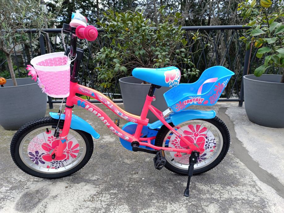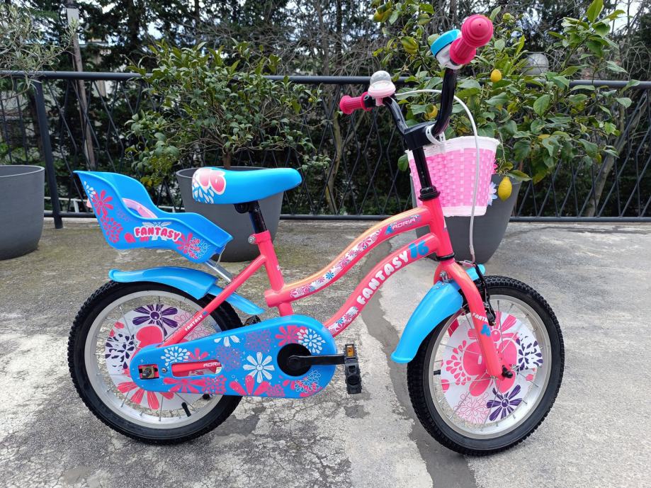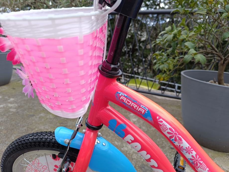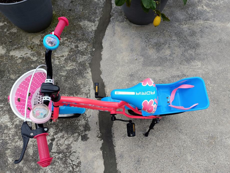 Prodajem dječji bicikl ADRIA Fantasy 16". Prednja kočnica V-brake, zadnja kočnica na pedali, ima i pomoćne kotače. Dodatno stavljena nogara i zvonca.