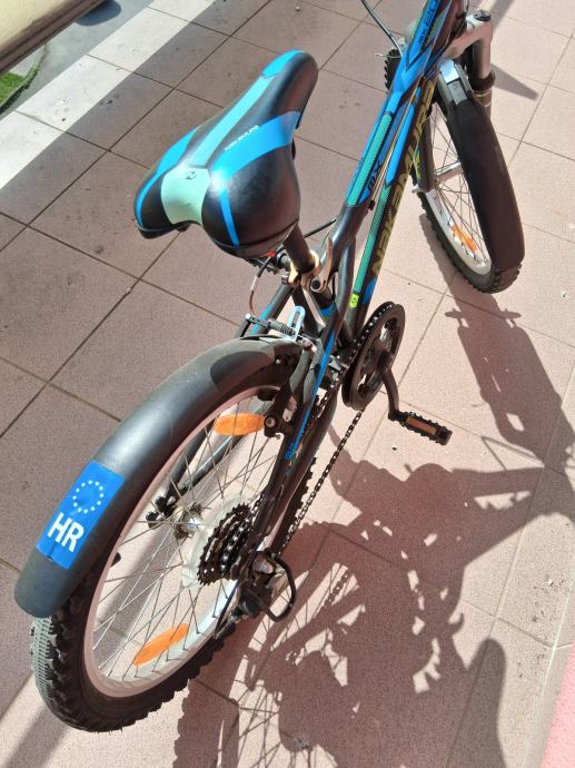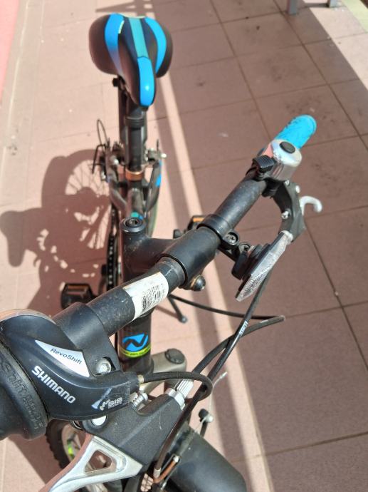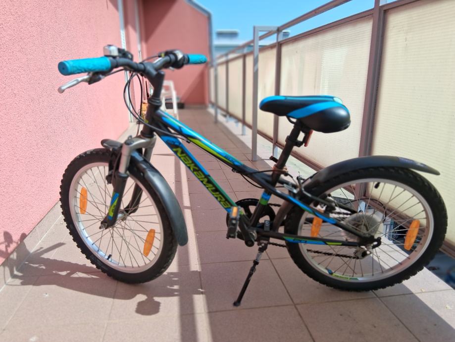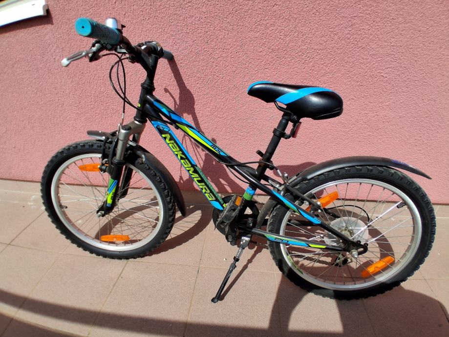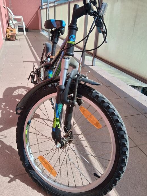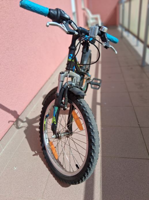 Prodajem dječji bicikl Nakamura MX20 s kotačima veličine 20 inča. Radi se o crnom biciklu s plavim i žuto-zelenim detaljima, opremljenom prednjom amortizacijskom vilicom, mjenjačem brzina, ručnim kočnicama i blatobranima. Bicikl u odličnom stanju.