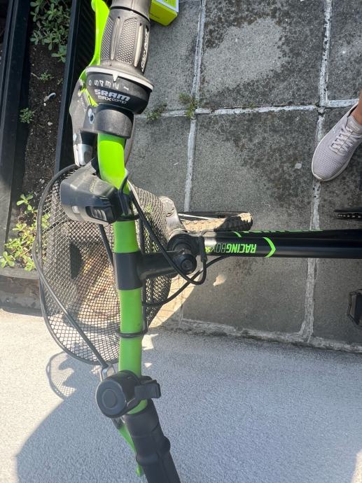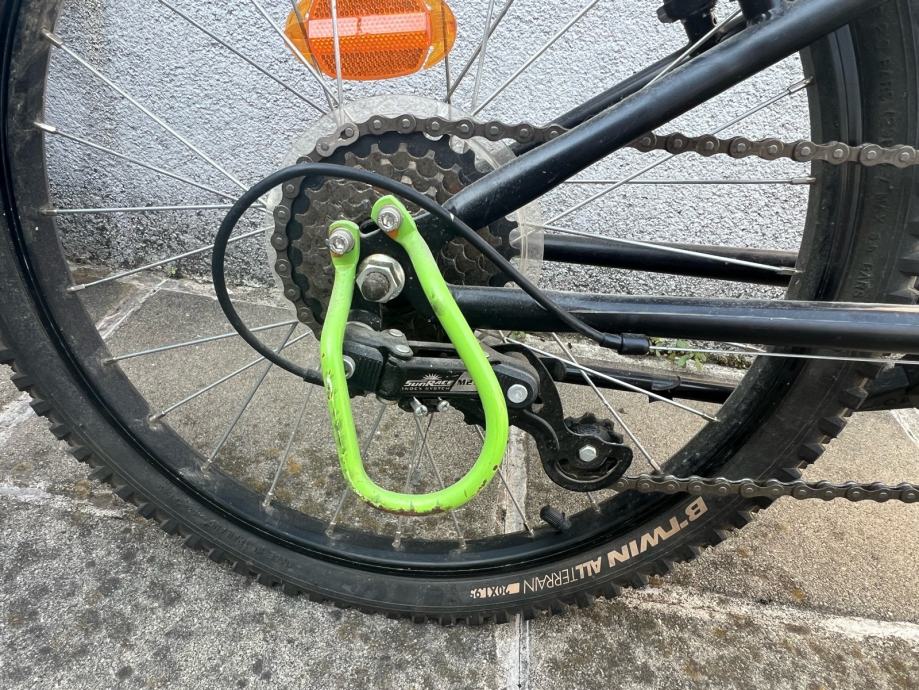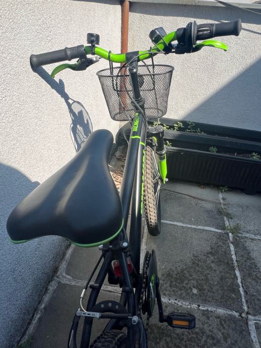 Dječji bicikl sa dodatcima (kosarica, svjetlo, zvono, nogica). Straznja guma mu je probusena.