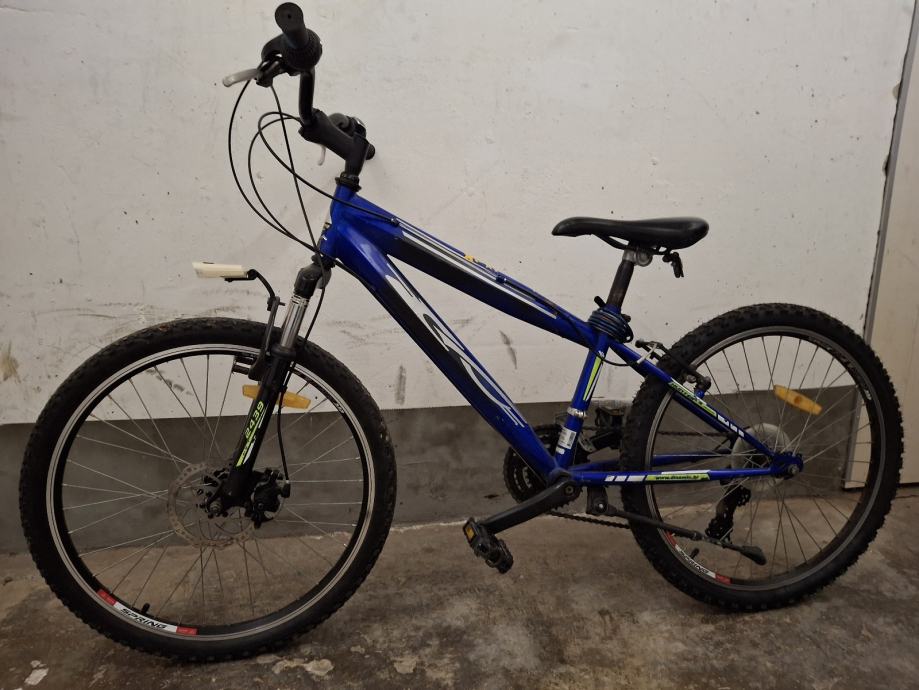 Prodajem dječji bicikl s kotačima veličine 14 inča. Radi se o rabljenom biciklu s mjenjačem brzina Shimano, prednjom amortizacijskom vilicom te terenskim gumama. Okvir je plave boje.
