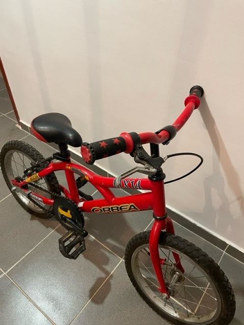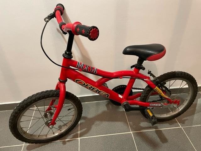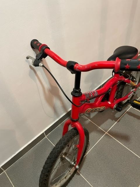 Dječji bicikl crvene boje s kotačima promjera 14", V-Brake kočnice, bez pomoćnih kotača.