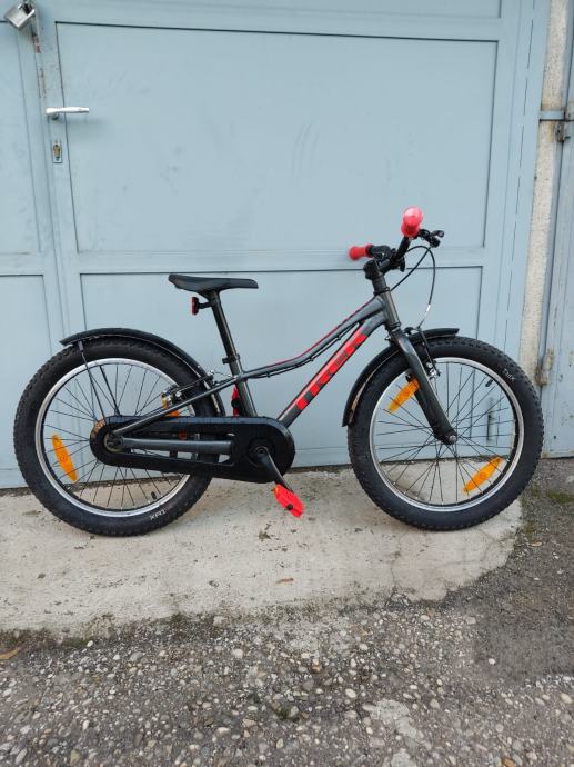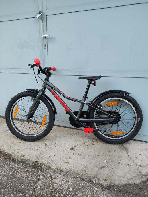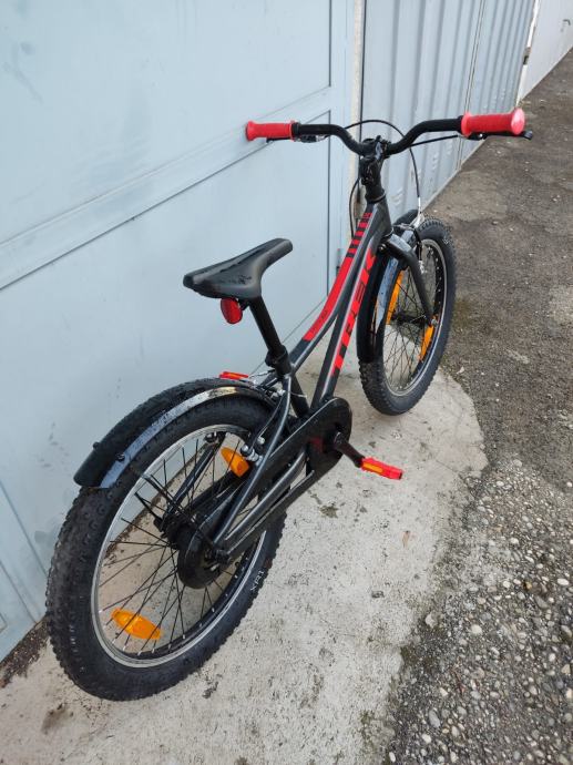 Prodajem novi dječji bicikl Trek s kotačima veličine 16 inča. Bicikl je crne boje s crvenim detaljima – crvene ručke upravljača, crveni svjetlosni signali i narančasti reflektori na pedalama i kotačima. Dolazi s blatobranicima i stalkom za parkiranje. Kotači su opremljeni terenskim gumama, a sjedalo i upravljač su podesivi po visini.