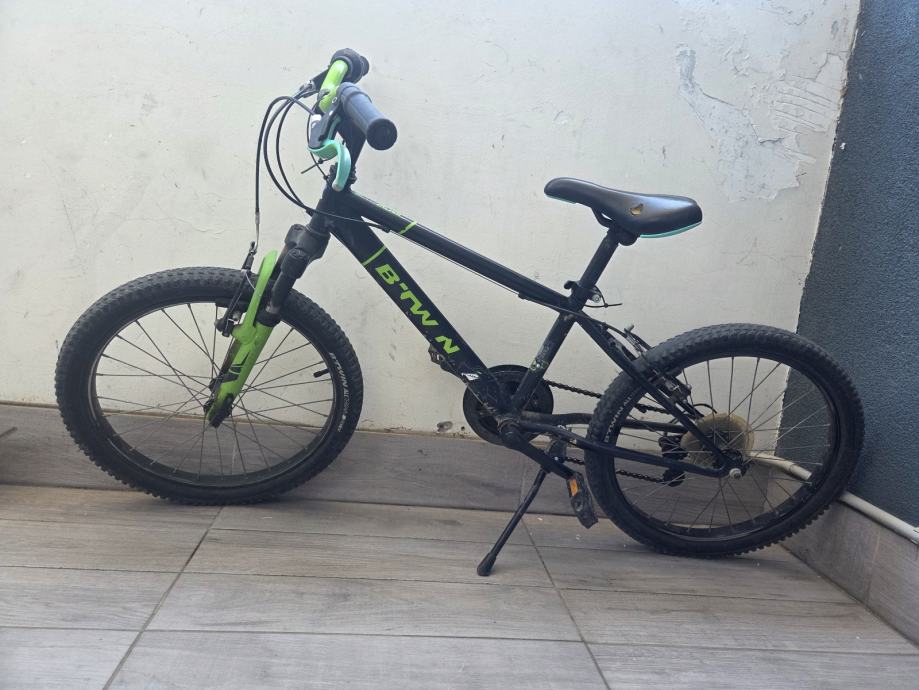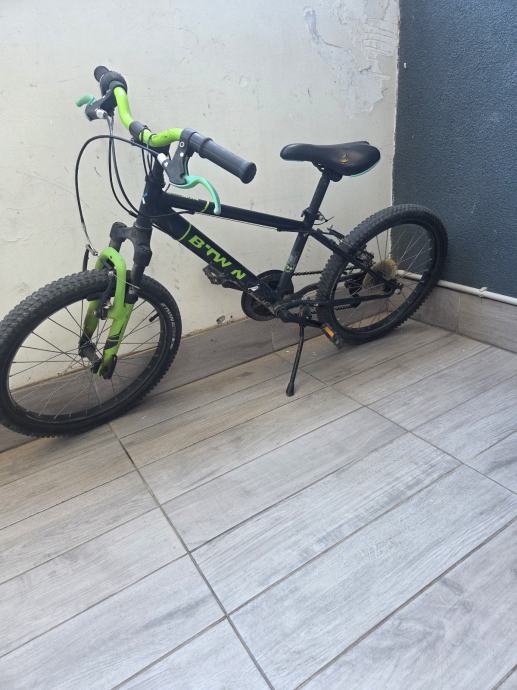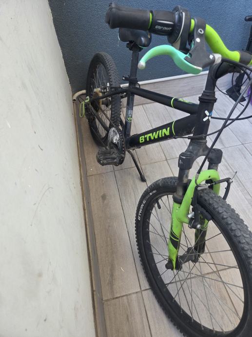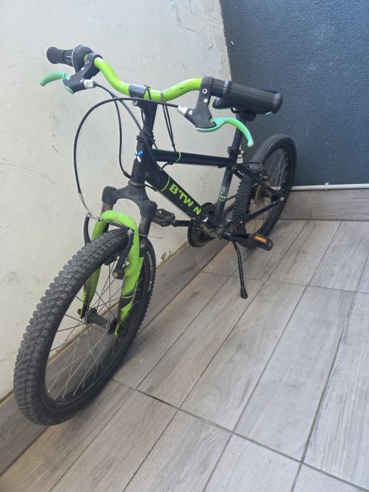 Prodajem dječji MTB bicikl B'Twin s kotačima veličine 20 inča, prikladan za djecu od otprilike 6 do 9 godina. Bicikl je crne boje sa zelenim detaljima, opremljen prednjim amortizerom, kotačima s terenskim gumama te ručnim kočnicama. Dolazi s postoljem za parkiranje.