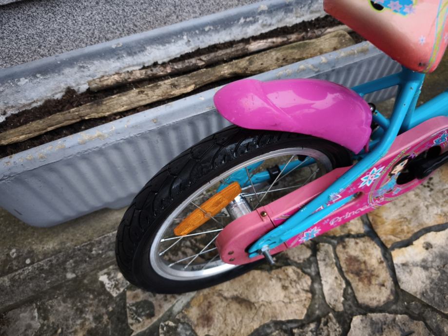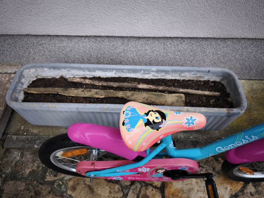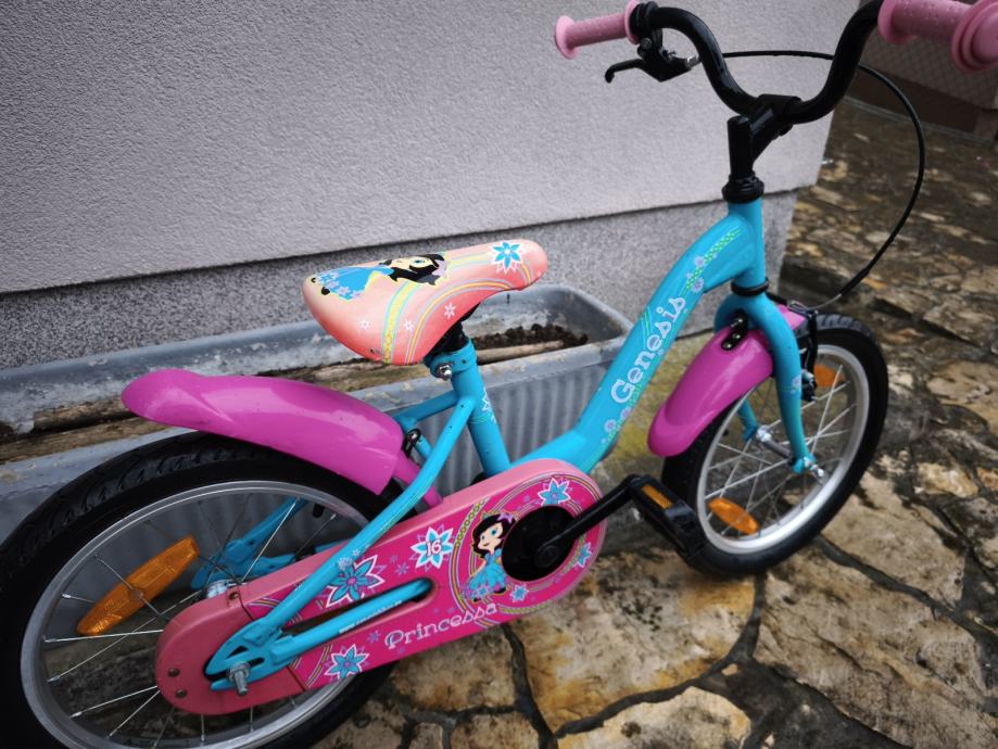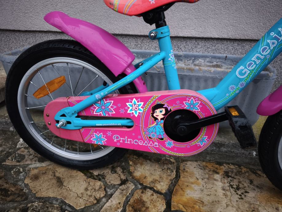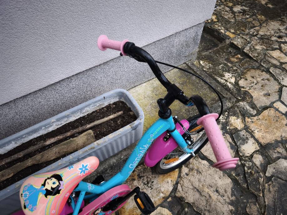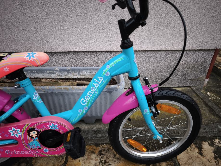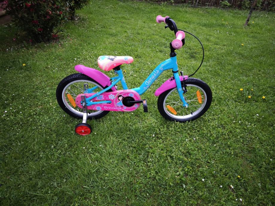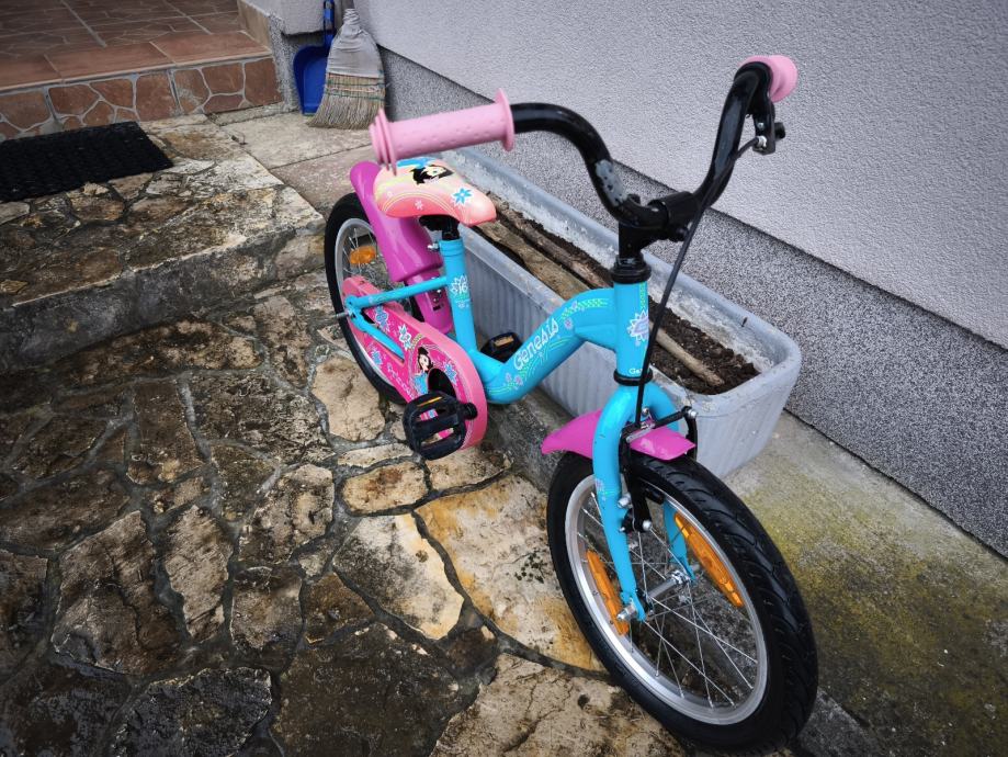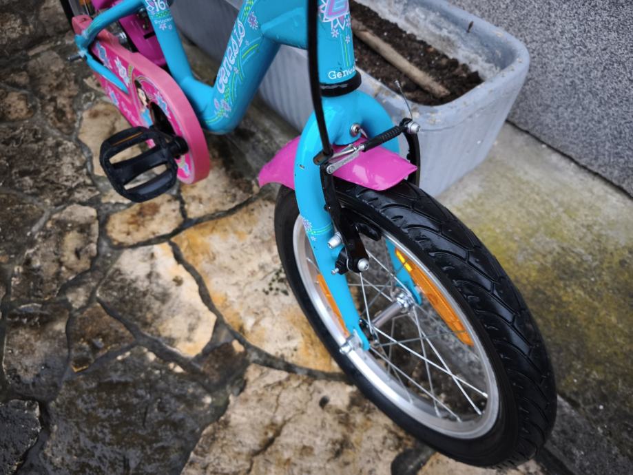 Dječji bicikl Genesis, kupljen u Intersportu, kotači veličine 16", bez brzina, prednja ručna, stražnja nožna kočnica, blatobrani, lancobran, novi pomoćni kotači.
