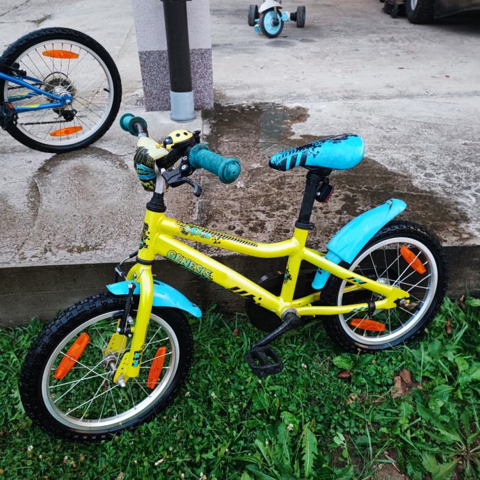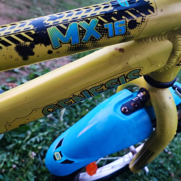 Genesis MX 16 je dječji bicikl s 16-inčnim kotačima, aluminijskim okvirom, V-kočnicom sprijeda i torpedo kočnicom straga. Malo korišten, kupljen u Intersportu za 1.200kn.