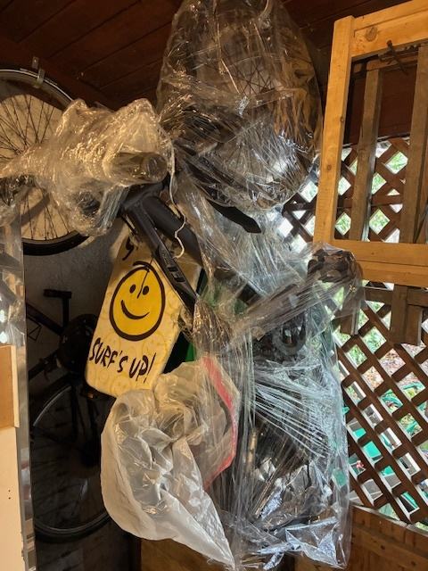 Bicikl je zamotan i obješen o kuku, te čeka novog vlasnika.
