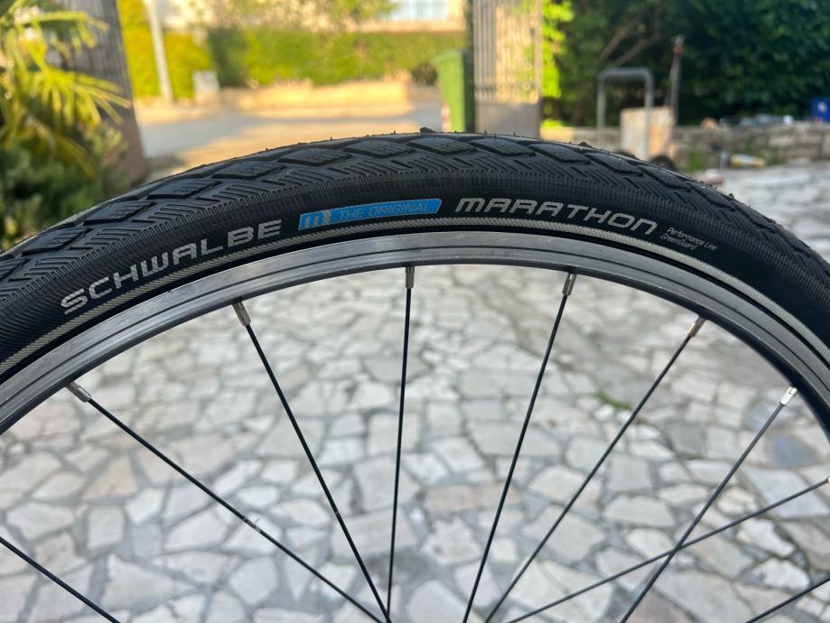 Bicikl je servisiran i na njemu su nove kvalitetne Scwhalbe Marathon gume.