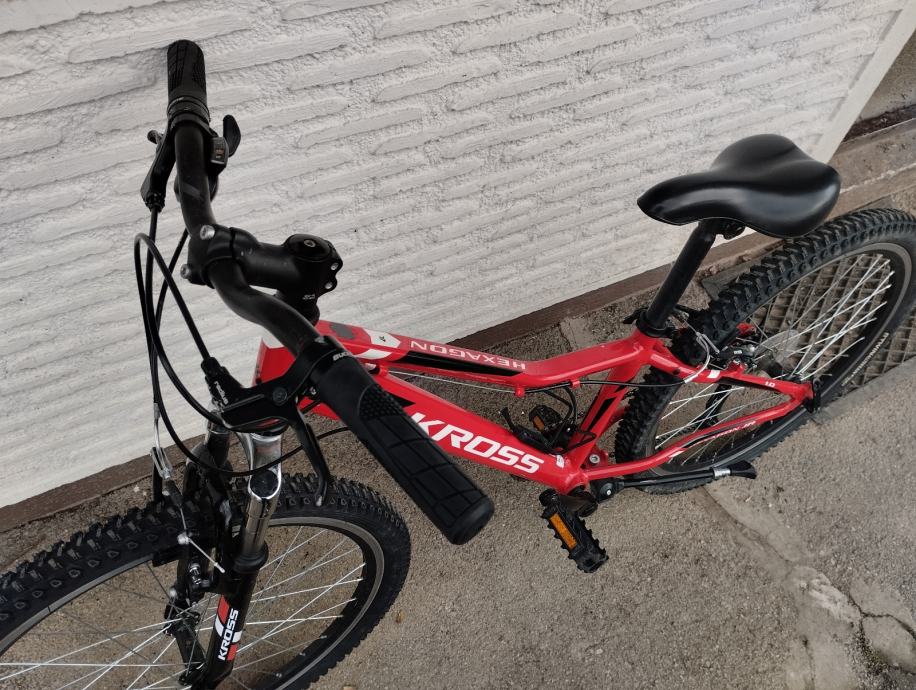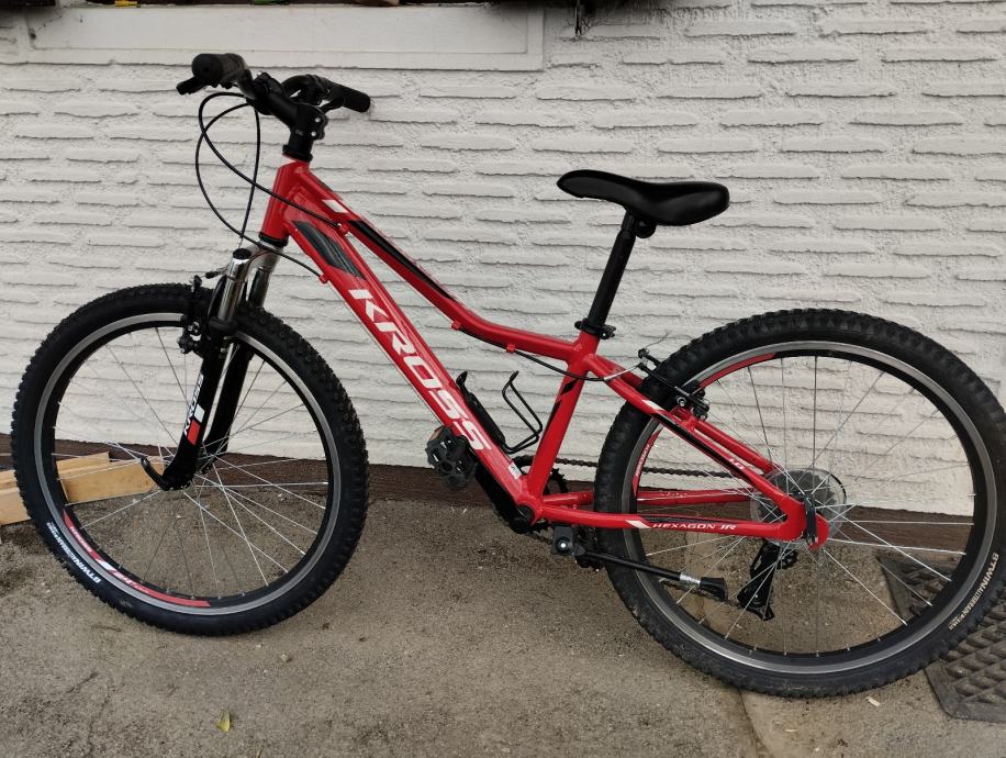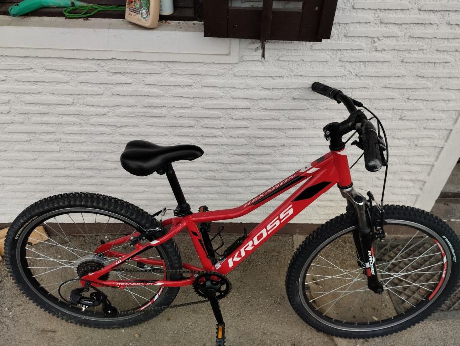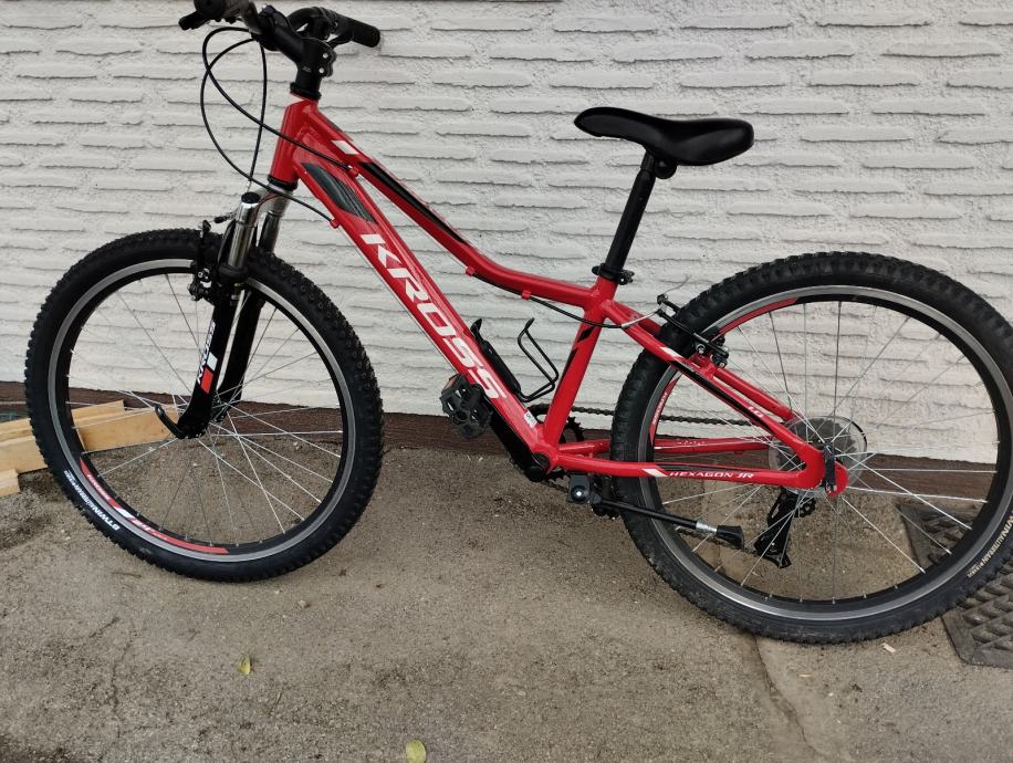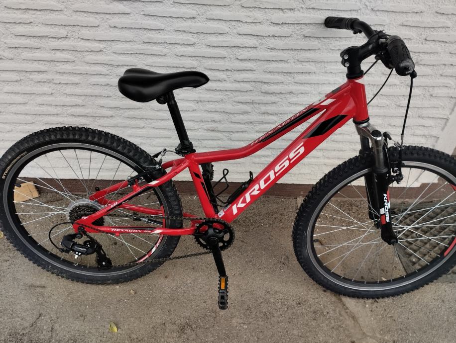Odličan dječiji bicikl Kross Hexagon za one koji traže kvačitetan dječiji rabljeni bicikl. Kotači 24". Prikladan za uzrast 6-10g. Aluminijska rama, S veličina. Aluminijski kotači. Na biciklu su nove široke gume 24x1.95, nogica i novi gripovi. Stražnji mjenač shimano turney sa 8 brzina, shimano rapid fire ručica mjenjača. Prednja suspenzija. Shimano pogon Upravo je napravljen servis i bicikl je spreman za nadolazeću sezonu. Moguć dogovor oko preuzimanja.