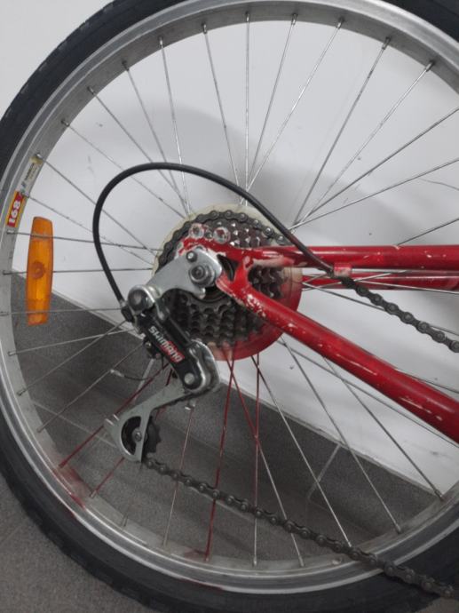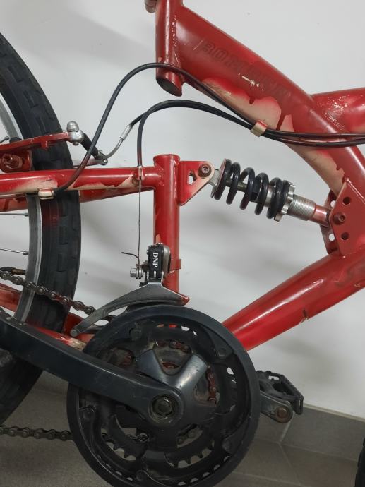 Prodajem rabljeni dječji MTB bicikl s full suspension sistemom i kotačima od 24 inča. Bicikl ima crveni okvir s prednjim i stražnjim amortizerima za udobniju vožnju po neravnim terenima. Idealan je za djecu koja vole brdski biciklizam i avanture u prirodi. Ima 3x6 shimano brzine, v-brake kočnice, grip shift ručice mjenjača, aluminijski obruči, jako malo vožen