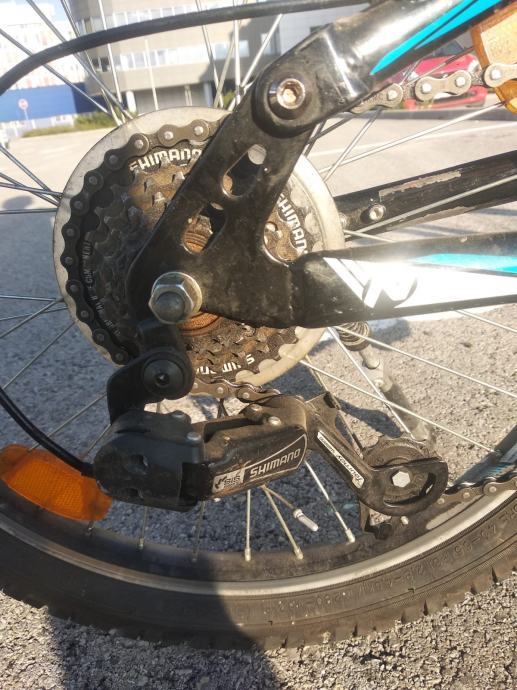 Ima 6 brzina, alu V-kočnice te prednju i stražnju suspenziju. Gume su u dobrom stanju, oprema je Shimano.