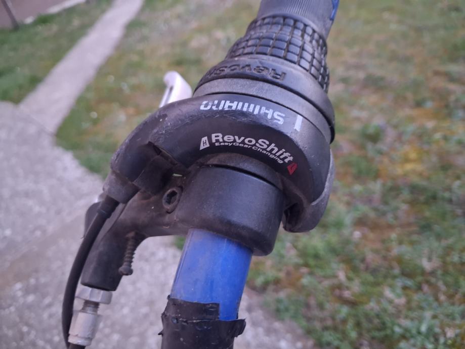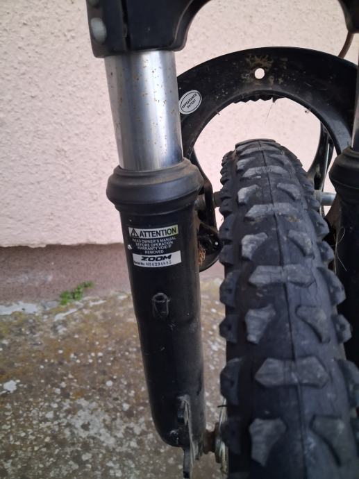 Bicikl ima prednji amortizer i brzine.