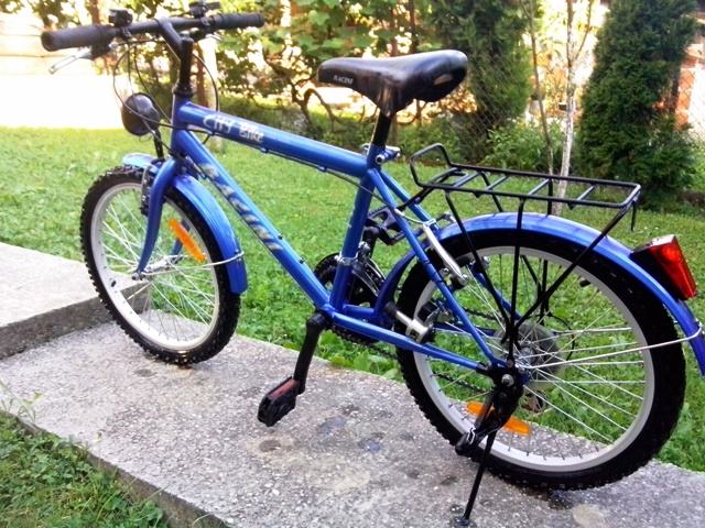 Prekrasan dječji bicikl svjetlo plave boje, kotači veličine 20", potpuno opremljen za udobnu i sigurnu vožnju Vašeg mališana(blatobrani, lancobran, nosač tereta, nogar, katadiopteri, V kočnice...). Tehnički odličan, 12 brzina(potpuno ispravan mjenjač), iznimno malo korišten tako da je uščuvanost izvrsna!!!(VIDI FOTOGRAFIJE)