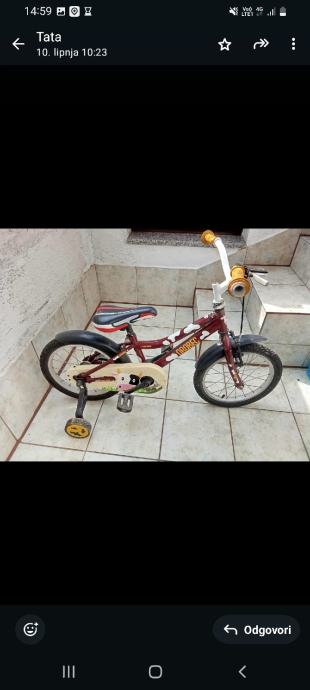 Prodajem djecji bicikl u odlicnom stanju. Od dodatne opreme ima prednje i straznje kočnice, pomoćne kotačiće koji se mogu odvojiti i blatobran. Predviđeno za dob od 3 do 6 godina.
