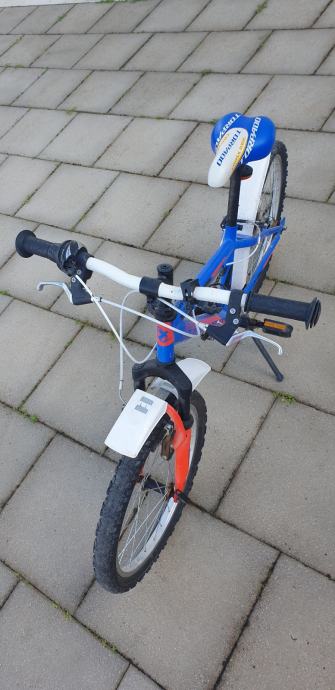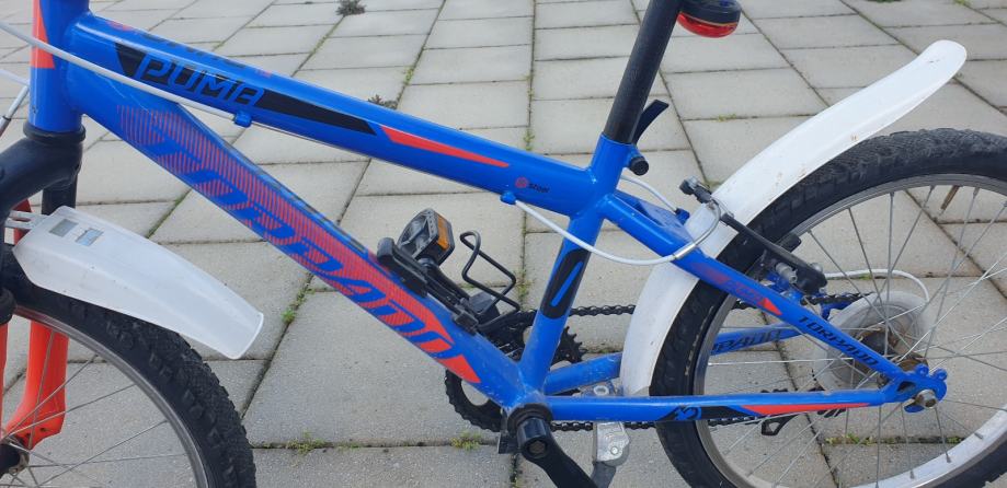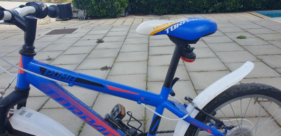 Prodajem dječji bicikl Puma Torpado s kotačima veličine 20 inča. Bicikl je u plavoj boji s crvenim detaljima i bijelim dijelovima na sjedalu i blatobranima. Okvir nosi Puma Torpado natpis.