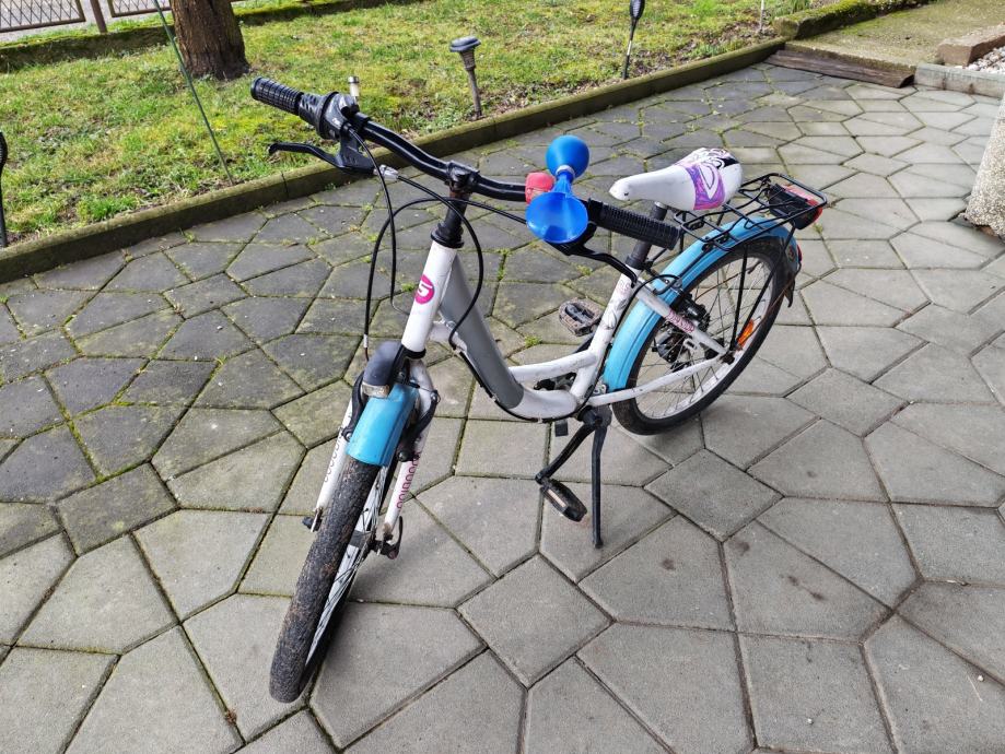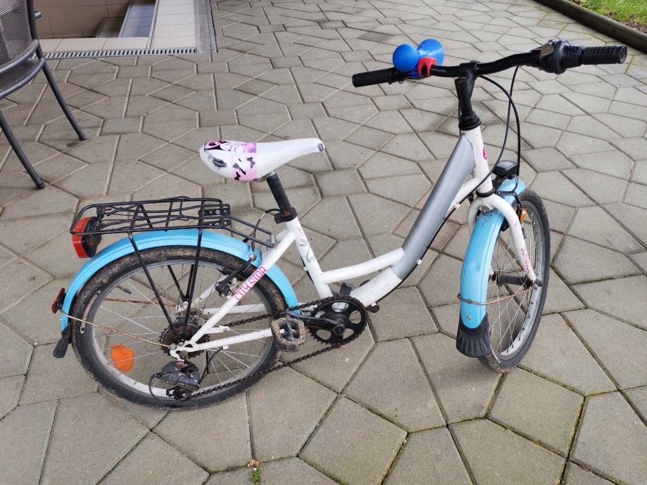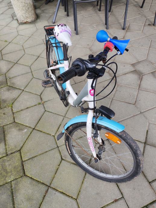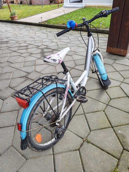 Prodajem Scirocco dječji bicikl s kotačima veličine 20 inča. Bicikl je u bijeloj boji s plavim detaljima na blatobranima. Opremljen je svjetlima , blatobranima i stražnjim prtljažnikom. Pogodan za djecu koja već znaju voziti ili uče vožnju s dodatnom podrškom.