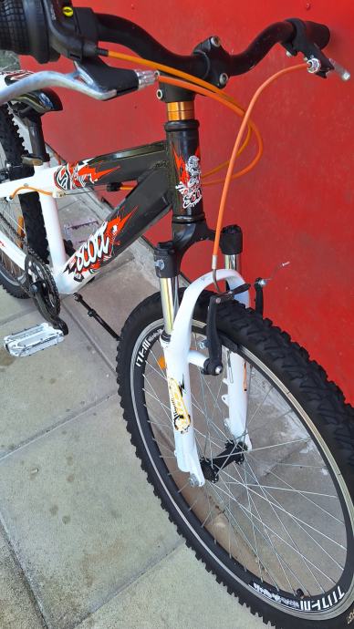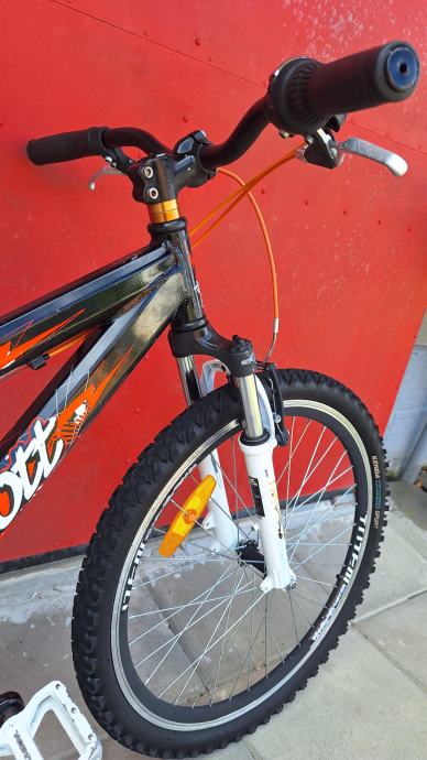 Prodajem dječji bicikl Scott Voltage 24, kotači 24" za djecu 7-12 godina, 1x6 prijenos, prednja suspenzija Zoom 50mm, Shimano mjenjač+RevoShift shifter, Tektro v-brake kočnice, Kenda gume 24x1.95, Kona flat pedale..