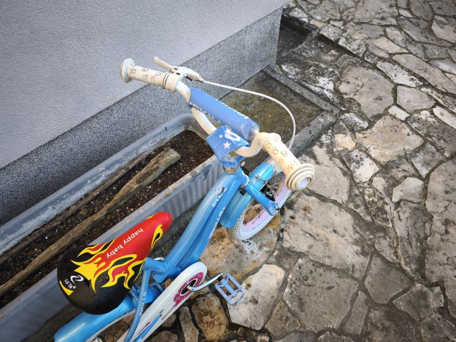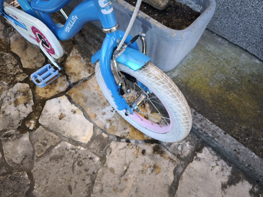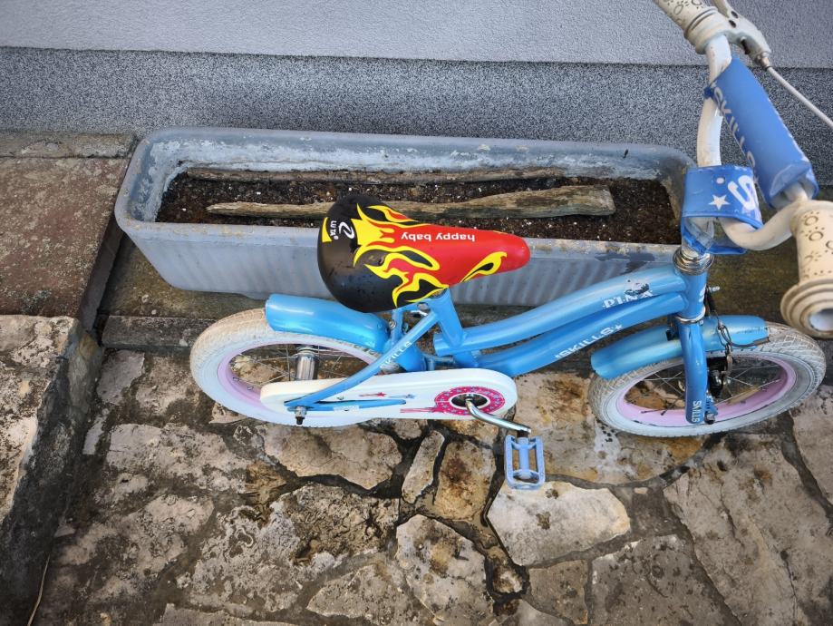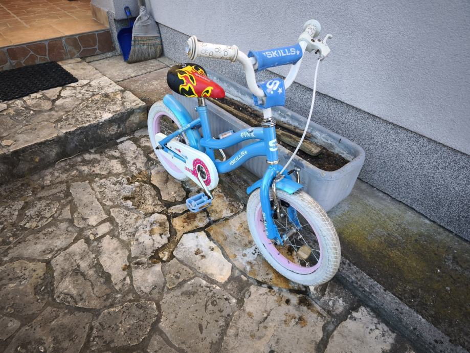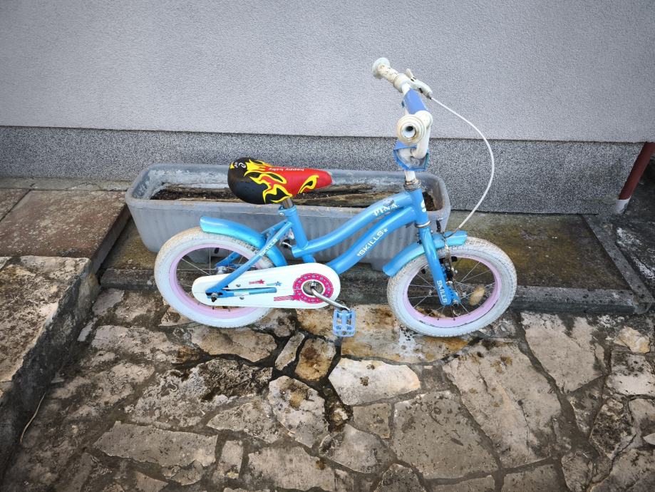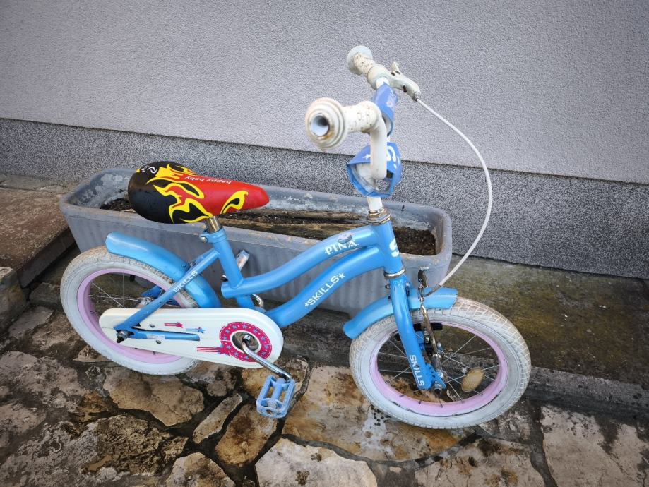 Dječji bicikl Skills Pina, kotači veličine 14", bez brzina, opremljen blatobranima, lancobranom. Gume odlične, sjedalo bez oštećenja, potpuno ispravan i spreman za sezonu.