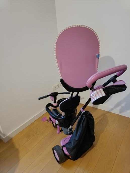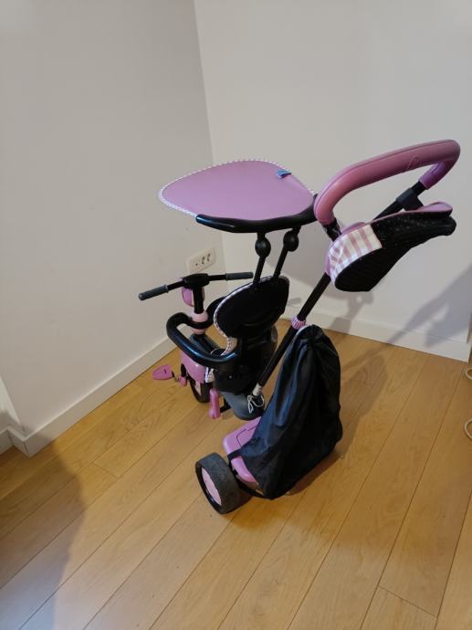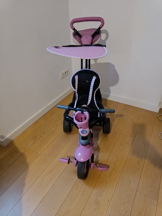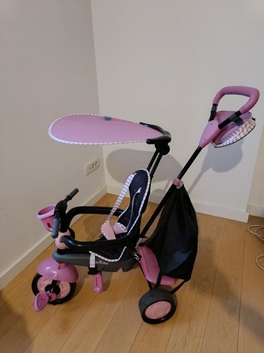 Tricikl guralica, sa suncobranom, pedalama, košaricom za bocu, torbicom i kutijom iznad zadnjih kotača za pohranu.