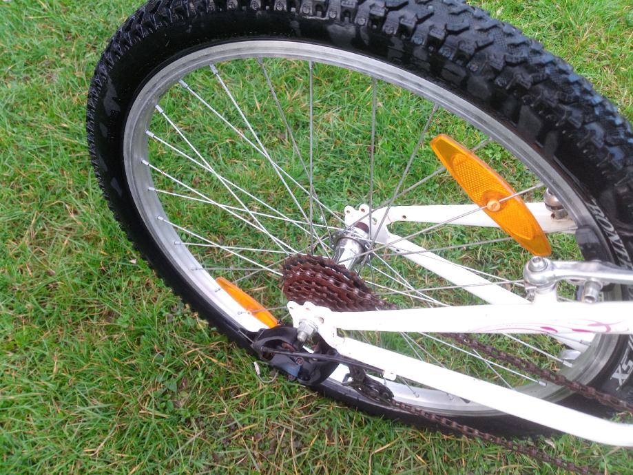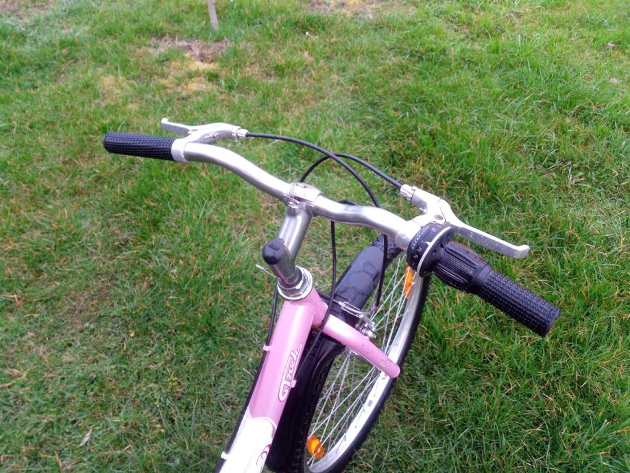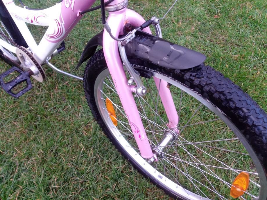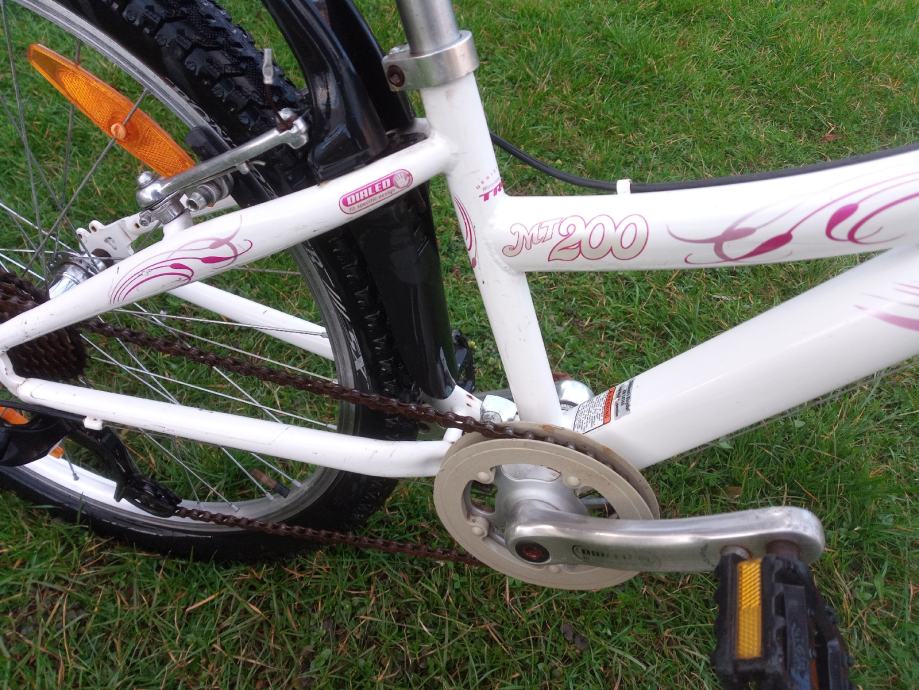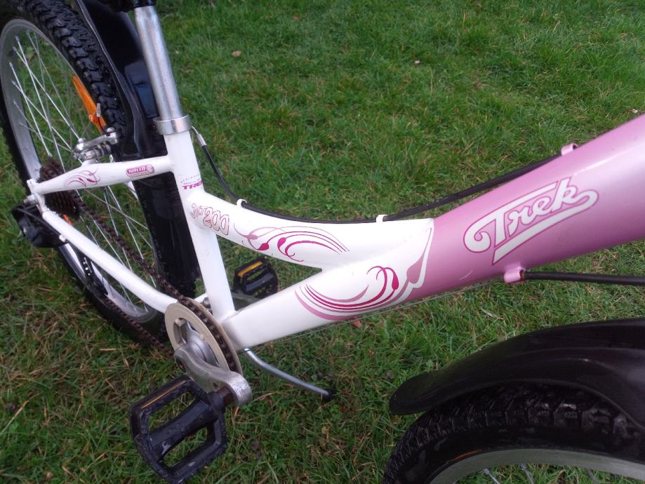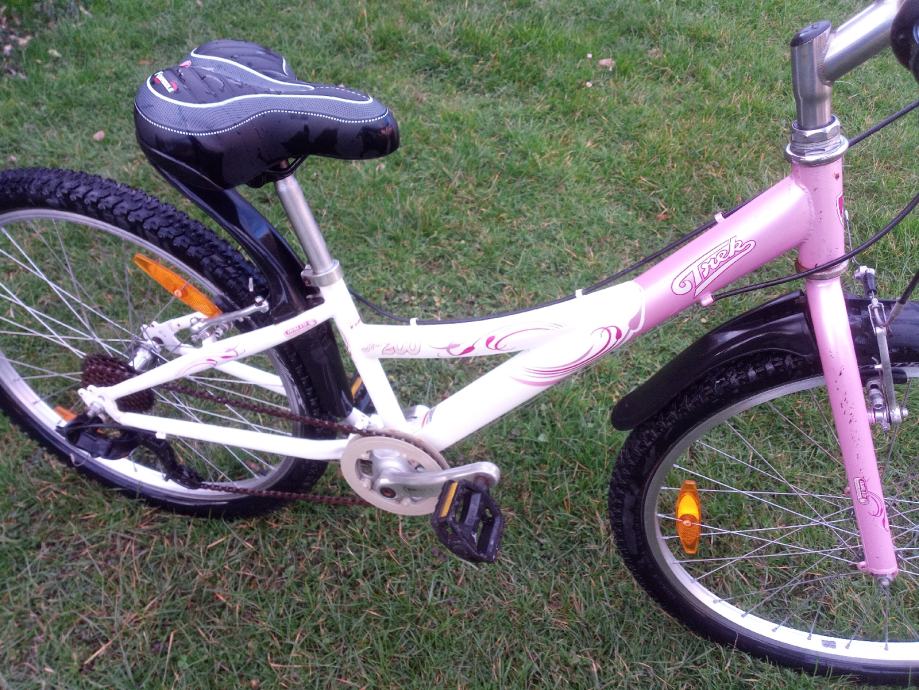 Dječji bicikl američkog proizvođača Trek, srednje veličine, kotači veličine 24". Sedam brzina sa ispravnim mjenjačem straga, pogon sa mogućnošću podešavanja visine pedala, opremljen blatobranima i nogarom. Gume odlične, sjedalo novo! Namijenjen klincima visine 130-155cm!