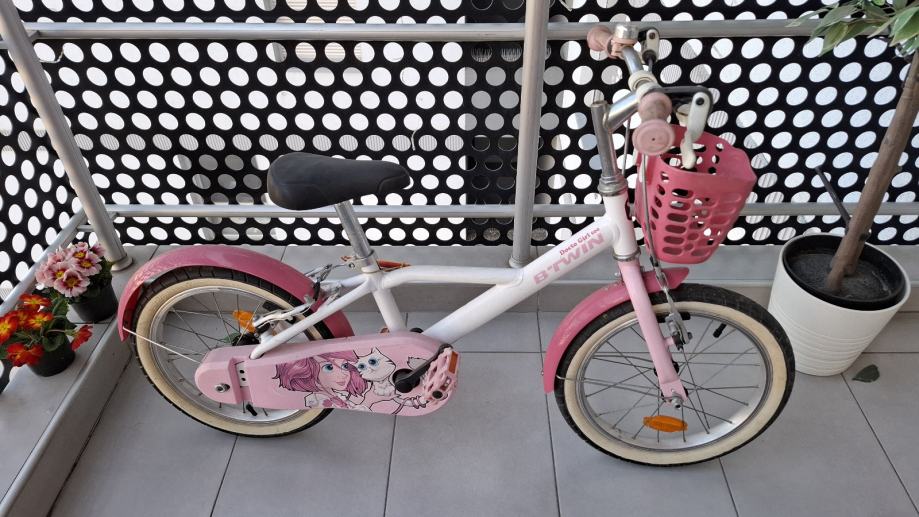 Prodajem dječji ženski bicikl s kotačima veličine 16 inča. Bijelo-ružičaste je boje s ružičastim blatobranima i ukrasima s motivima mačića na okviru. Dolazi s košaricom sprijeda i crnim sjedalom. Kotači imaju bijele bočnice što mu daje lijep izgled.