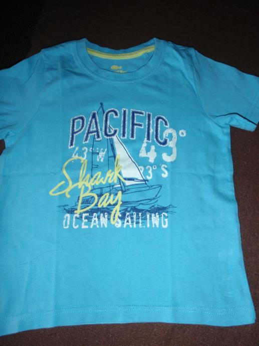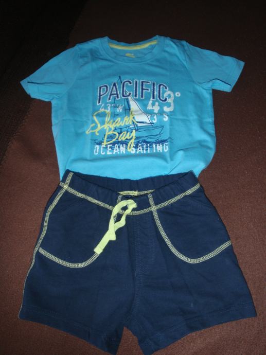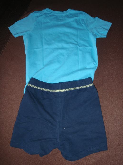 Dječji komplet kratke hlače i majica Lupilu. Veličina 98/104. Materijal pamuk. Kratke hlačice su tamno plave boje, dok su obrubi i detalji zagasito žute boje. Hlačice imaju džepove. Majica je tirkizno plava sa slikom i detaljima zagasito žute i tamno plave boje. Jako dobro očuvano, bez flekica i oštećenja.
