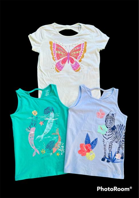 LOT 3 CARTERS pamučne majice vel.152/158. novo, nenošeno, samo oprano. Preslatke majice, jedna je s kratkim rukavima, a druge dvije bez rukava, sa preslatkim aplikacijama leptira, sirene i žirafe, skupo plaćene, kupljene u USA.