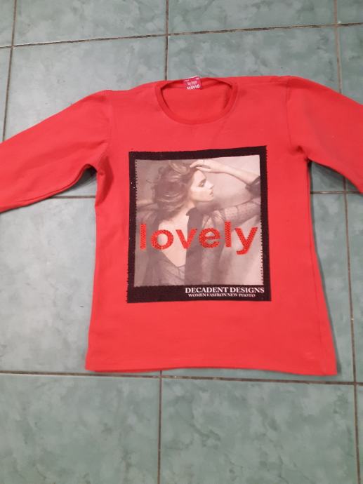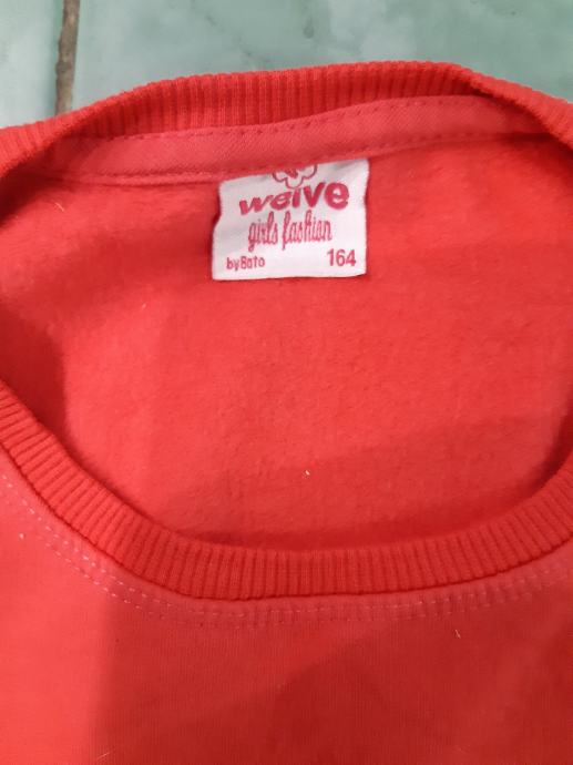 1. WEIVE FASHION crvena pamucna majica sa zanimljivom slikom, dugih rukava. Sirina prsa, prednja strana: 42 cm, dužina: 52 cm, rukav: 47 cm.