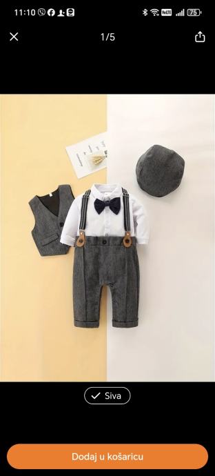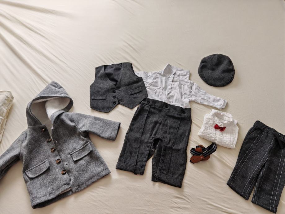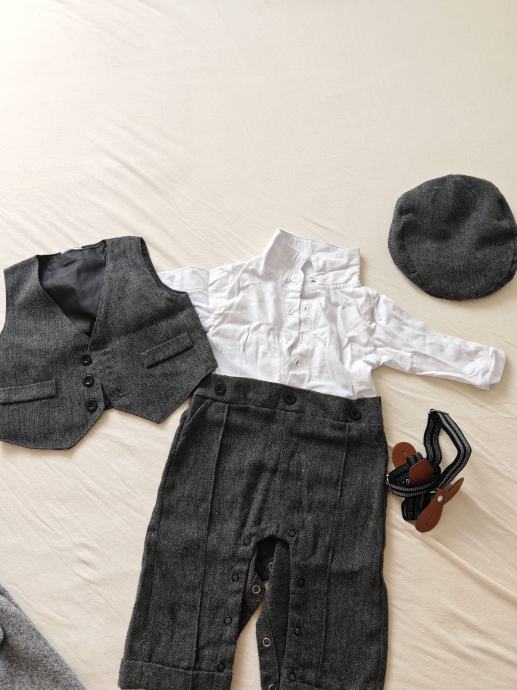 -sivi prsluk, jednodijelni kombinezon, siva kapica te pripadajuća leptir mašna. Komplet je savršen za posebne prilike poput krštenja, vjenčanja ili drugih svečanih eventa.