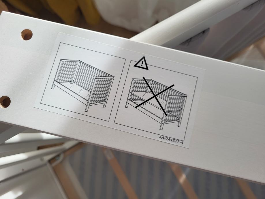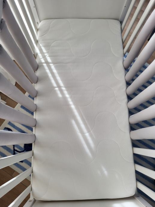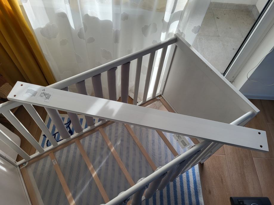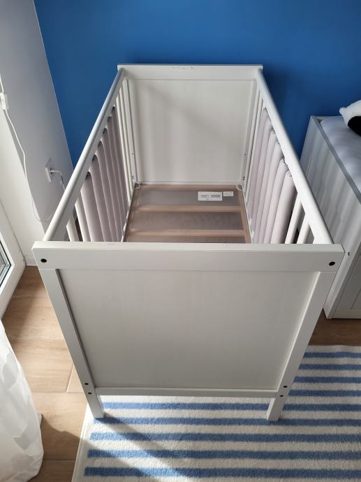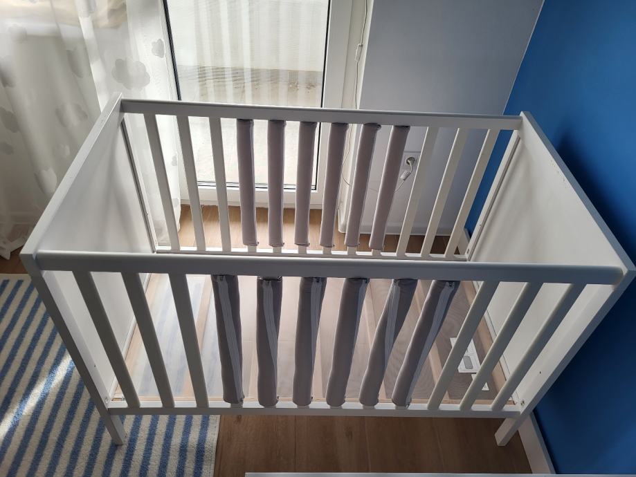 Bijeli drveni SUNDVIK krevetić 60×120 cm, s podesivom visinom madraca i uklonjivom bočnom stijenkom, dizajniran za sigurnost. U kompletu prodajem madrac i Sundvik komodu za presvlačenje te zaštite za letvice kreveta u sivoj boji.