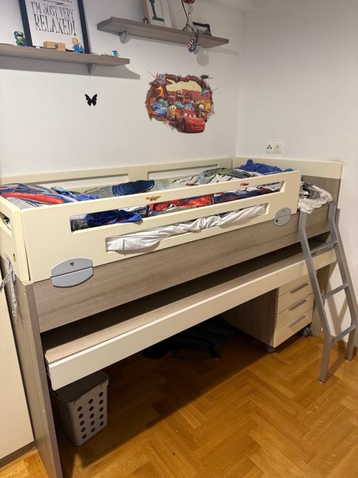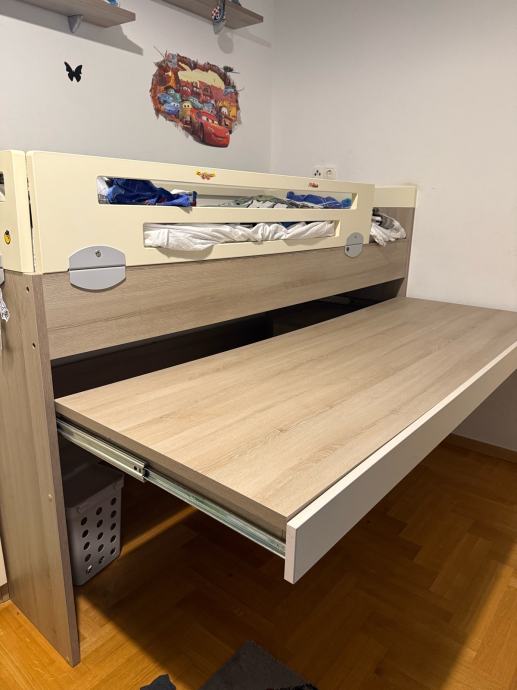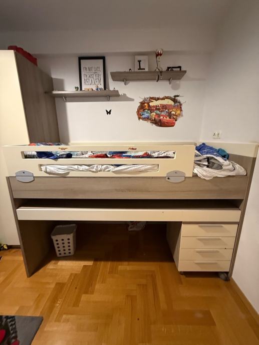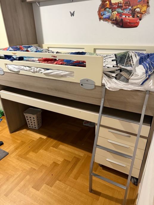 Krevet je dimenzije 180x85cm, ima radni stol na izvlačenje i komodu ladicama na kotače