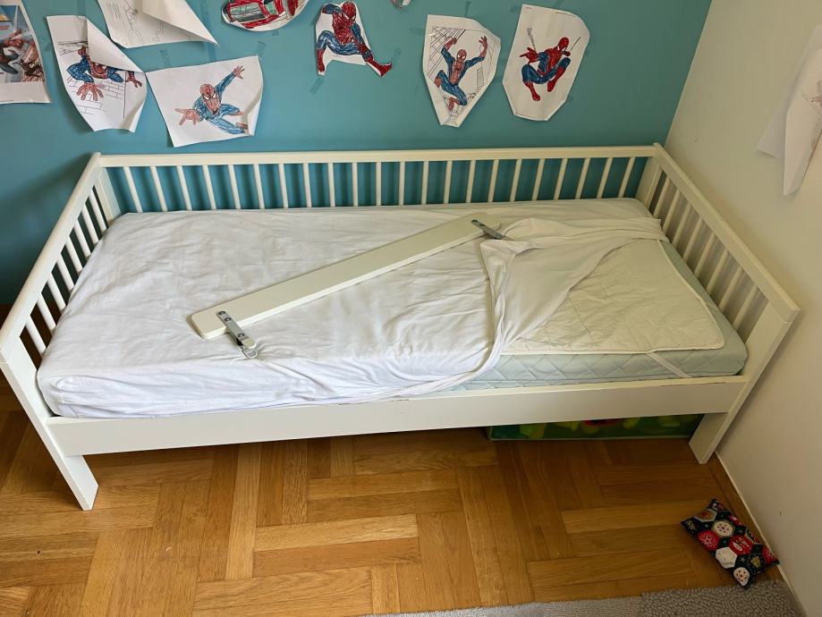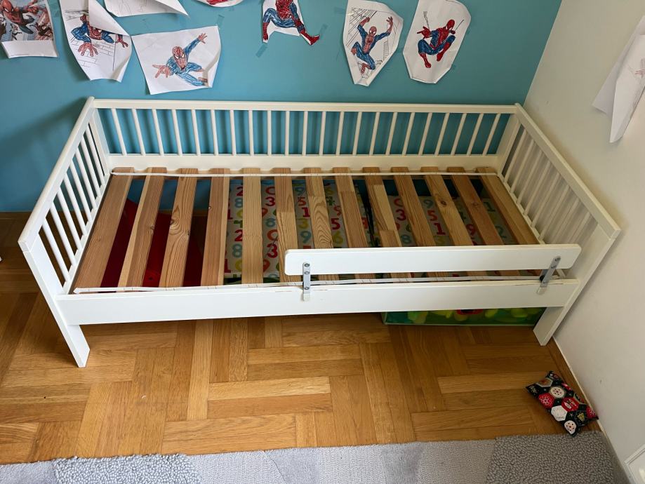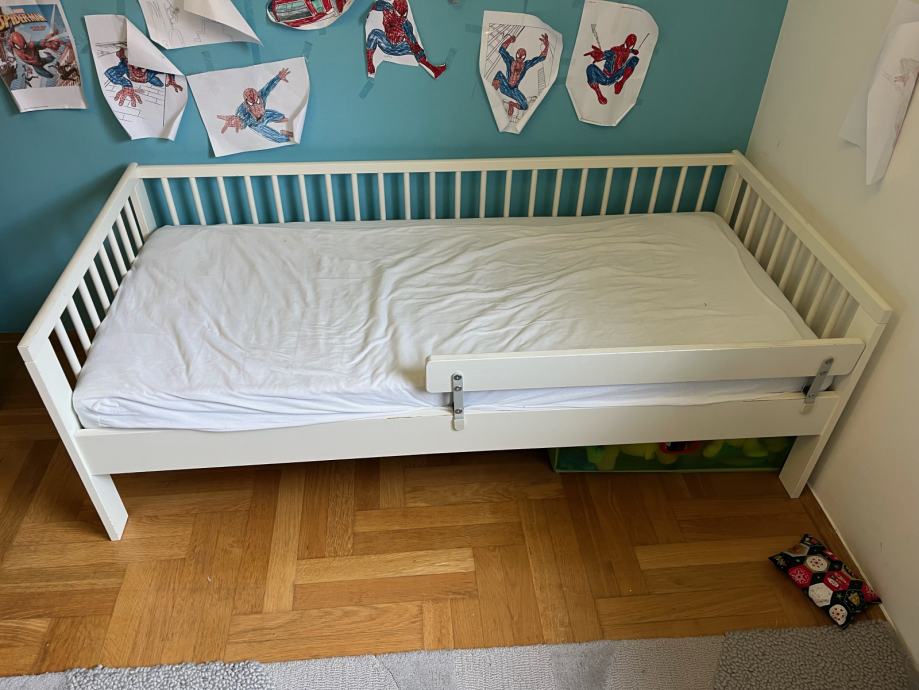 U potpunosti ispravan IKEA dječji krevet 70x160 s madracem, podnicom, zaštitnom ogradom, zaštitnom navlakom te 2-3 donje plahte.
