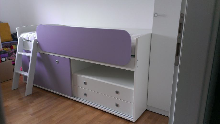 Krevet dim 100×200 cm, visine 1 m sa stepenicama, dolje duboki ormar 100×100×100 cm, 2 ladice i polica.