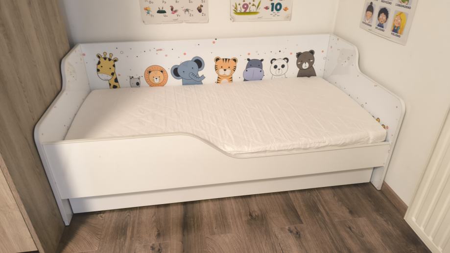 Dječji krevet Lilu u obliku kauča s printom veselih životinja dimenzija 160 x 80 cm.