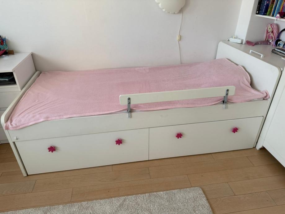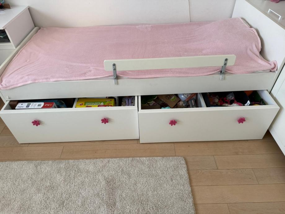 Prodajem Ikea Slakt dječji krevet, 90x200 cm, bijeli s ogradicom, bez madraca. Manje oštećenje s lijeve strane nastalo prilikom sastavljanja (vidljivo na slici). Ladice su posebno izrađene po mjeri. Cijena kreveta s ladicama 120€, bez ladica 80€.