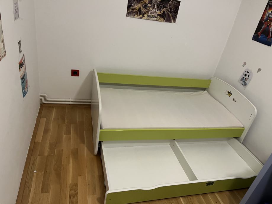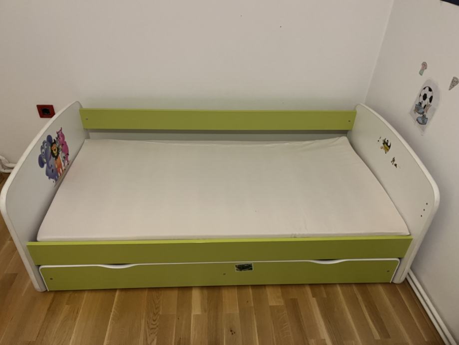 Poklanjamo dječji krevet s ladicom za posteljinu za madrac 160x80 s letvičastom podnicom. Krevet je u dobrom stanju, podnicu bi trebalo učvrstiti ili zamijeniti neke letvice. Madrac ima tragove korištenja