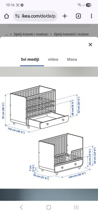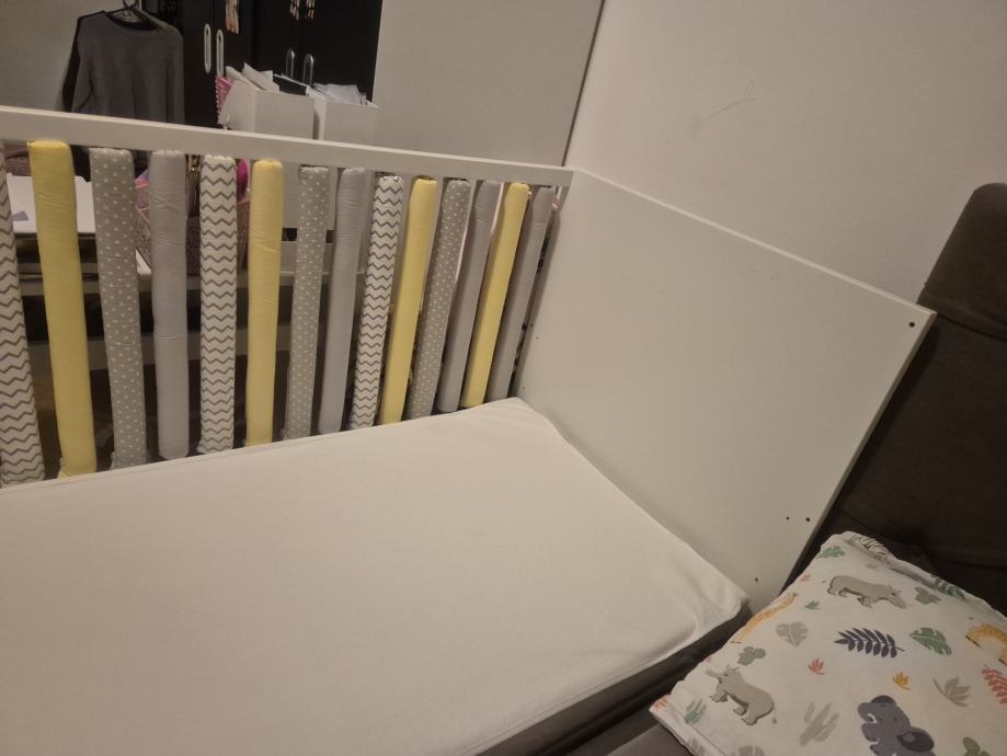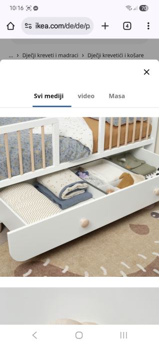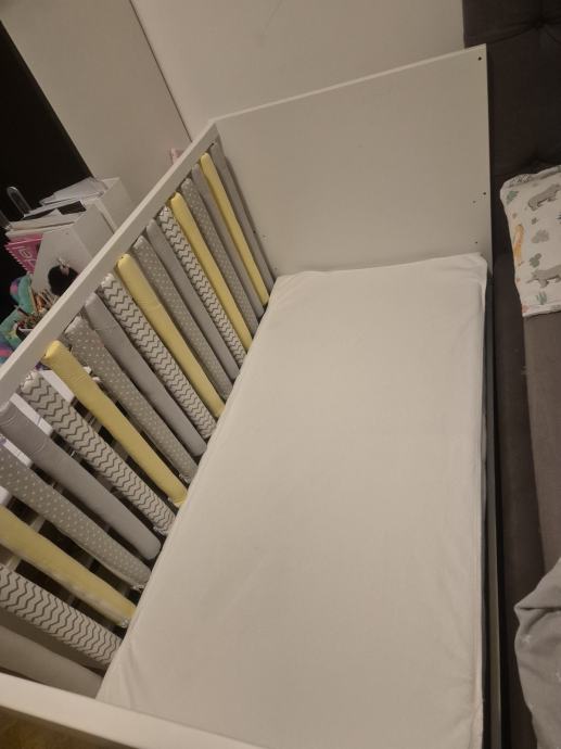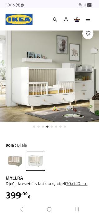 Prodajem IKEA MYLLRA dječji krevetić u bijeloj boji s ladicama za pohranu. Krevetić ima mogućnost podešavanja visine dna na dva nivoa kako dijete raste. Praktičan dizajn s integriranim ladicama omogućava dodatni prostor za spremanje dječjih stvari. Dimenzije krevetića su 70x140 cm. Krevetić je stabilan i funkcionalan, korišten svega nekoliko mjeseci.