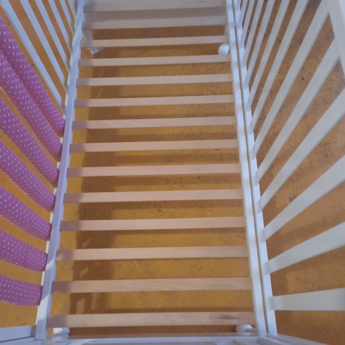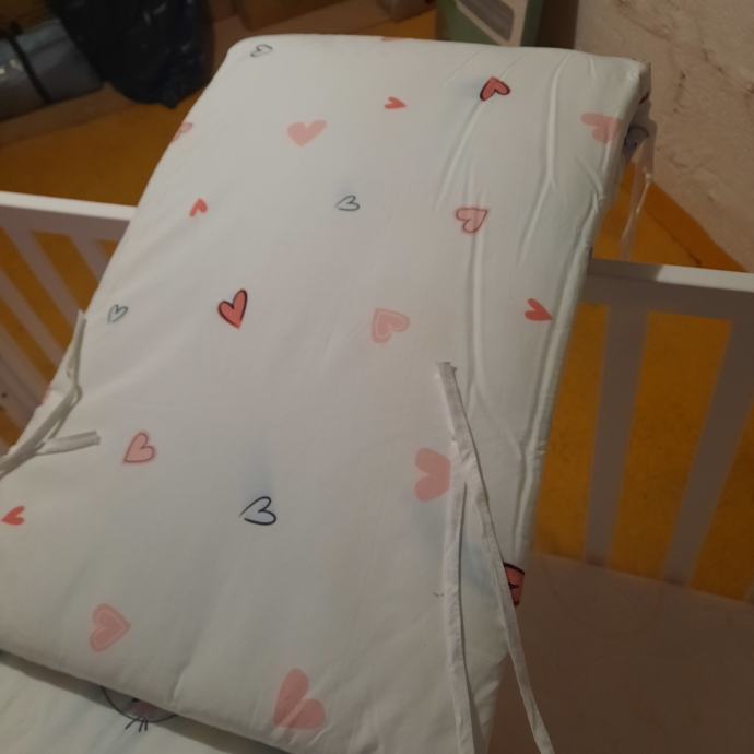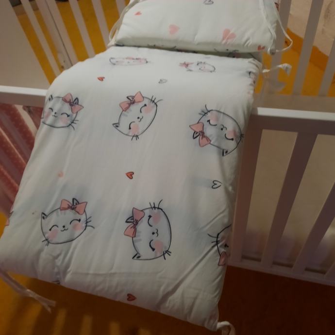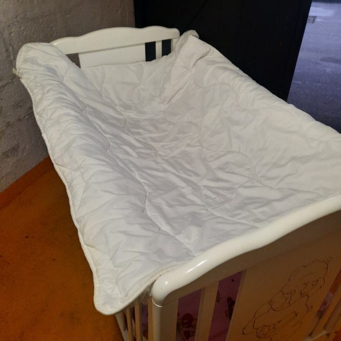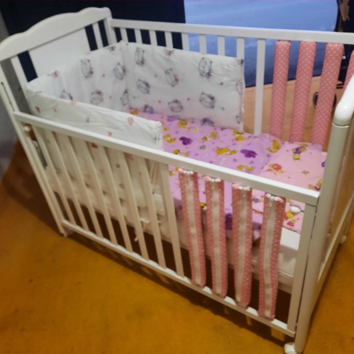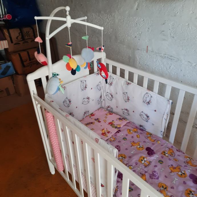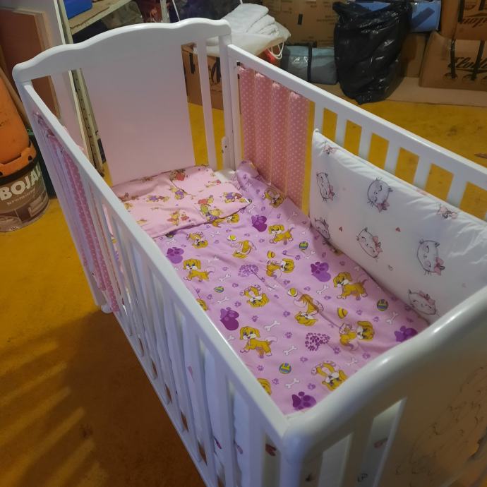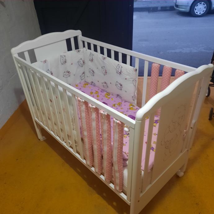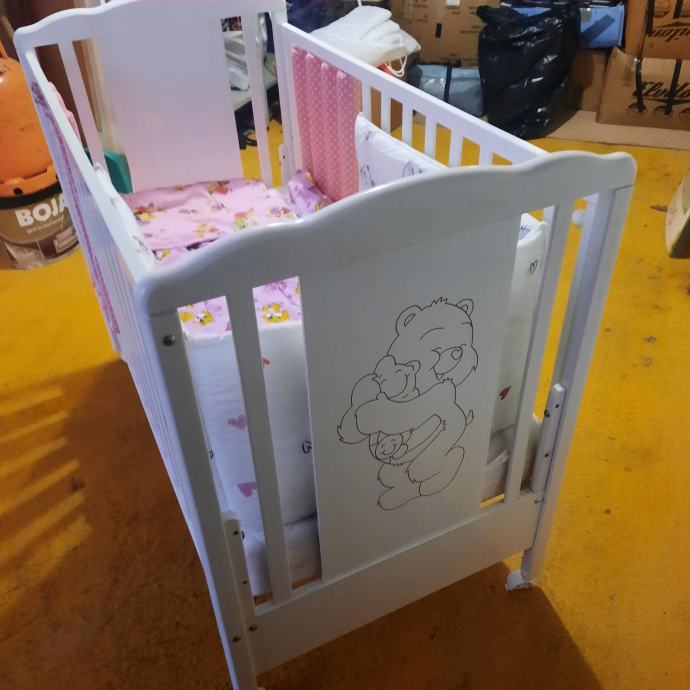 Uz kinderbet dolazi kvalitetan madrac(14.cm.debljine) sa perivom navlakom,vrtuljak koji svira,2.popluna deblji i tanji , jastuk,ogradica i zastite za stranice, igracke sa slike.