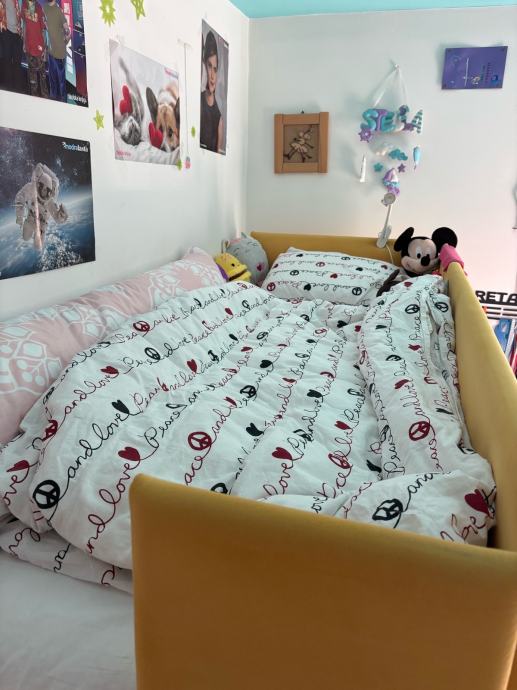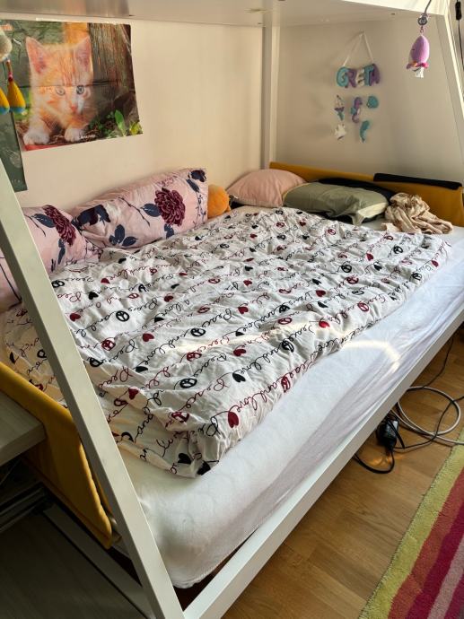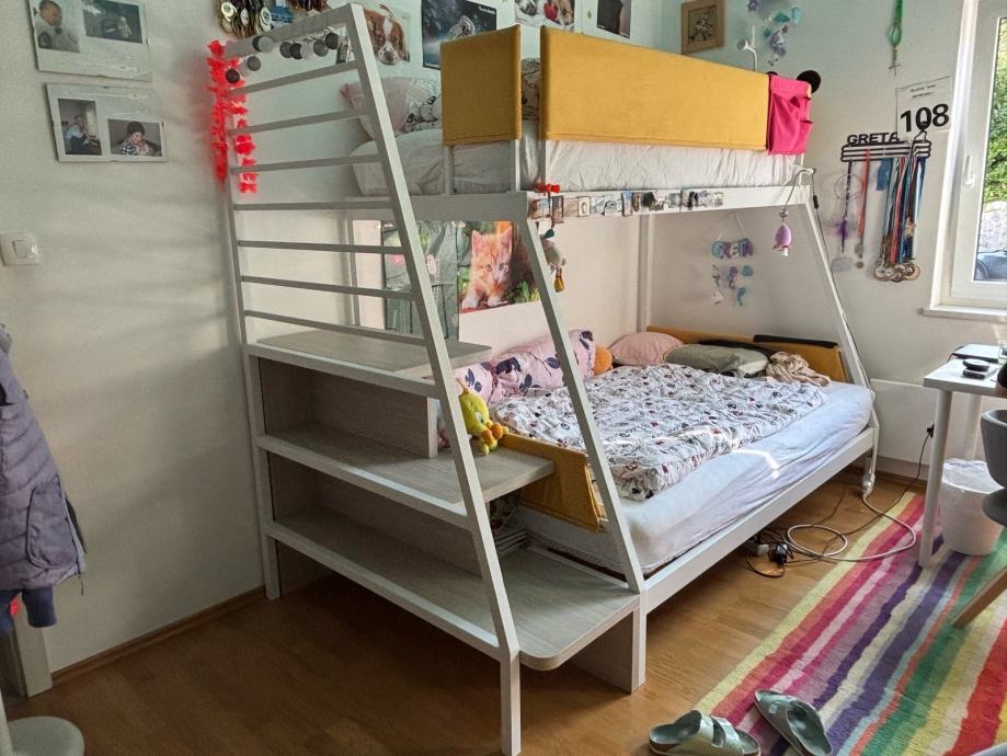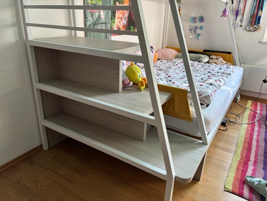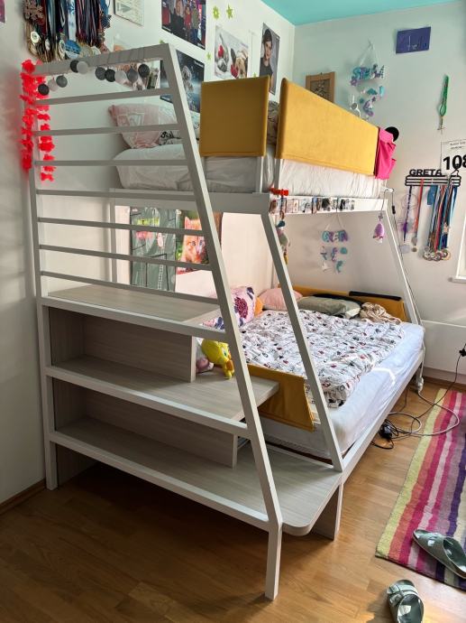 Djecji krevet na kat sa stepenicama i policama - gornji krevet 80x190cm, donji 120x190cm. Dimenzije citavog kreveta: 128x246cm, visina 184cm. Uz krevet idu i podnice i madraci i par donjih plahti za madrace. Cijena nije fiksna!