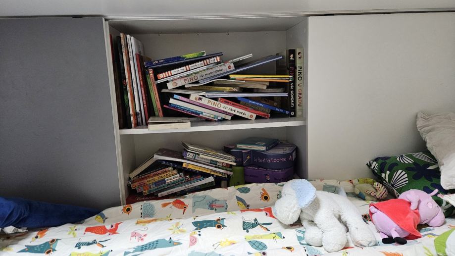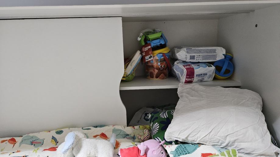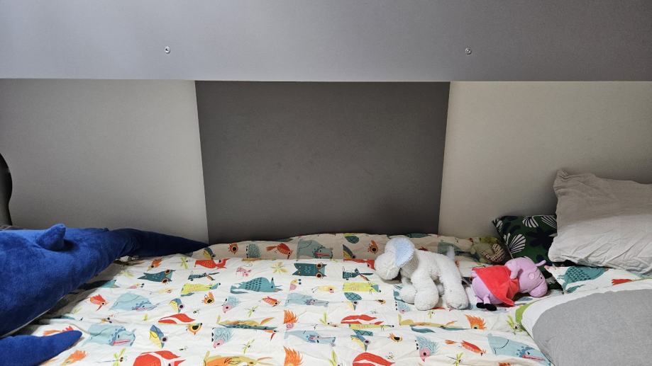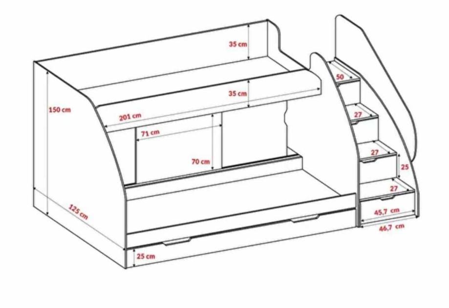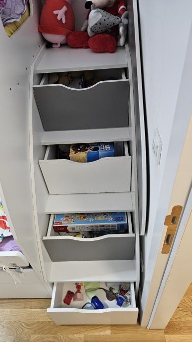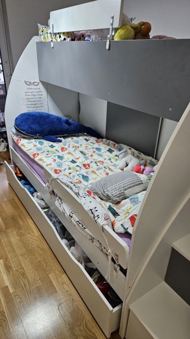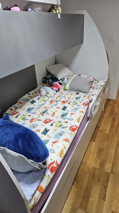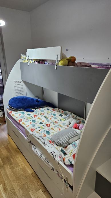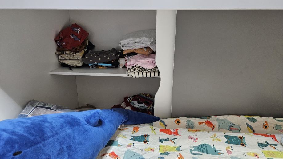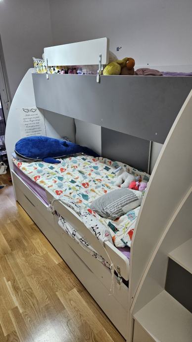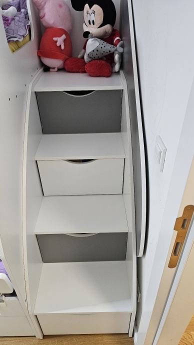 Krevet na kat s puno prostora za pohranu. U svakoj stepenici je ladica. Ispod donjeg kreveta je velika ladica a iza donjeg kreveta je ormarić s tri odjeljka.