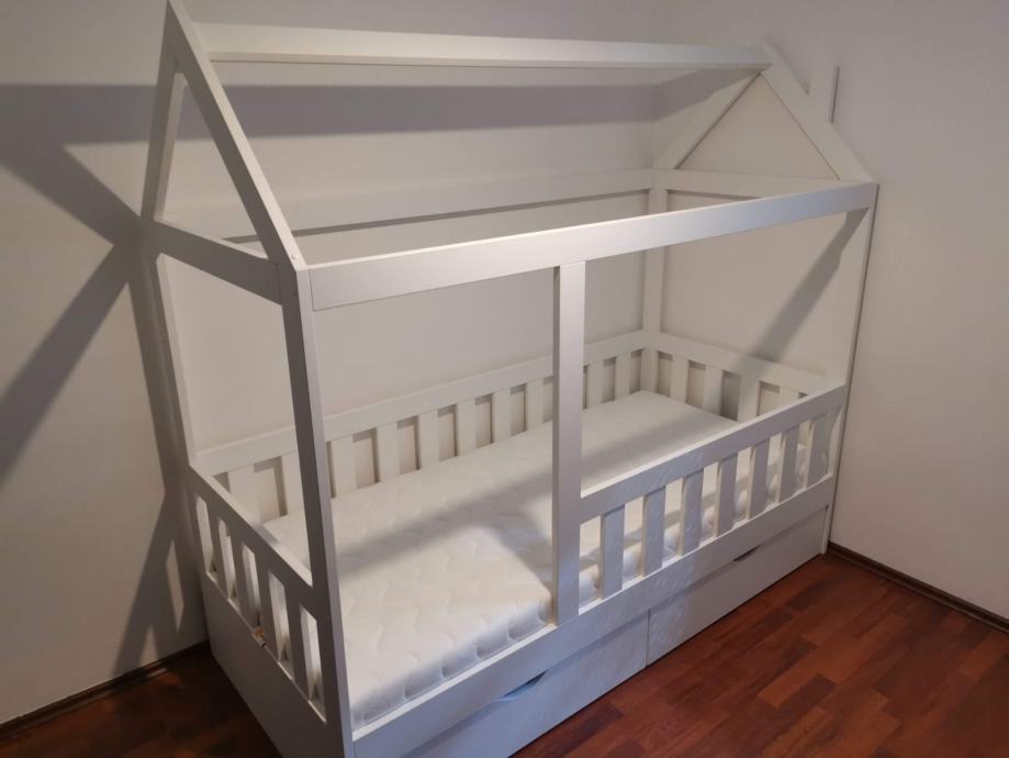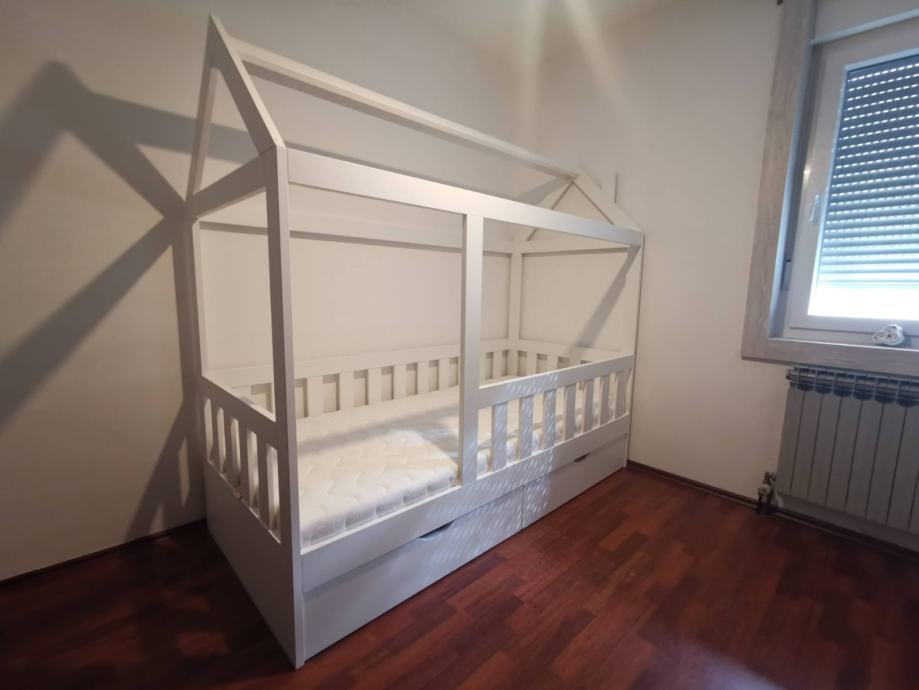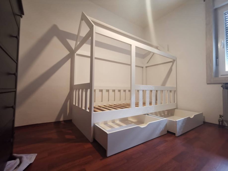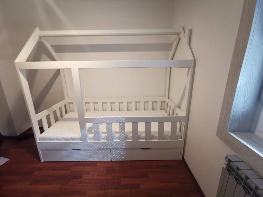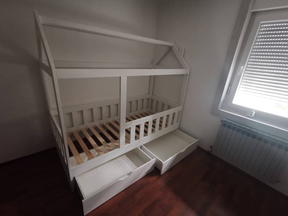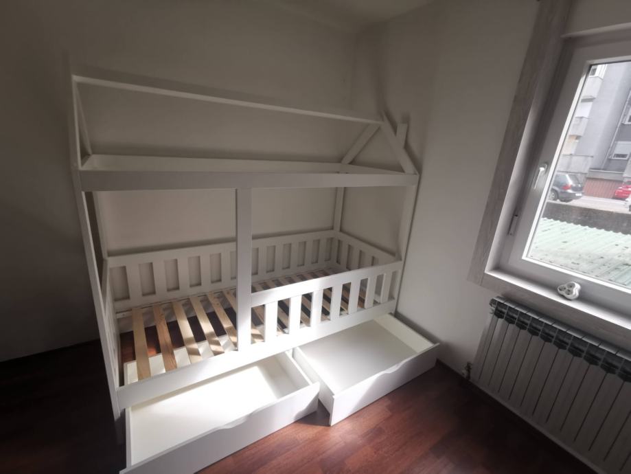 Krevet je rađen po narudžbi i nemoze se kupiti u ducanu. Rijetko je koriste dimenzije madraca 200*90cm ima dvije ladice za robu i posteljinu. Krevet je trenutno rastavljen projaje se da madrscem