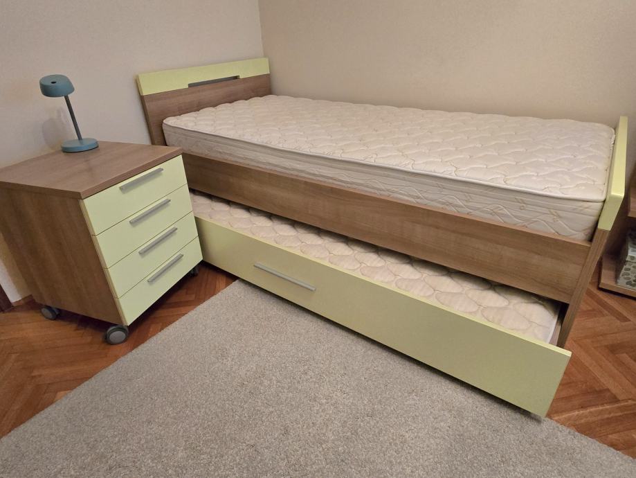 Vrlo kvalitetan krevet s podnicom i dva Hespo madraca. Glavni madrac 200 x 90 cm, a pomoćni (za goste) 190 x 80 cm. Izvrsno ocuvano. Uz krevet ide i ormarić 50 x 50 cm s 4 ladice istog dizajna.