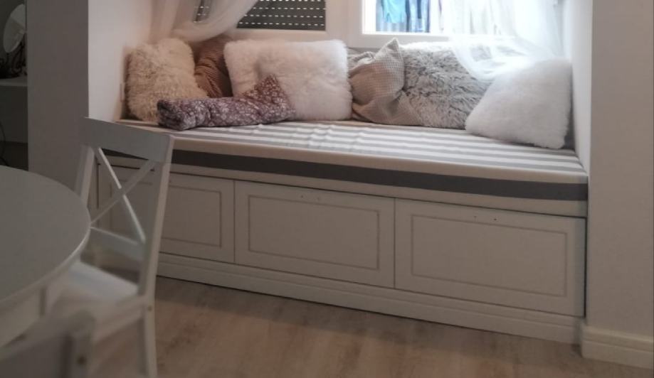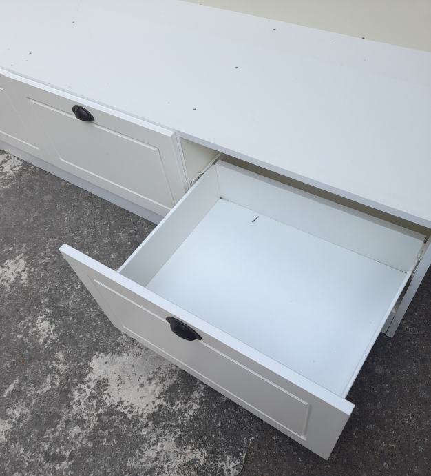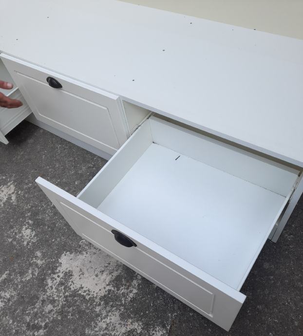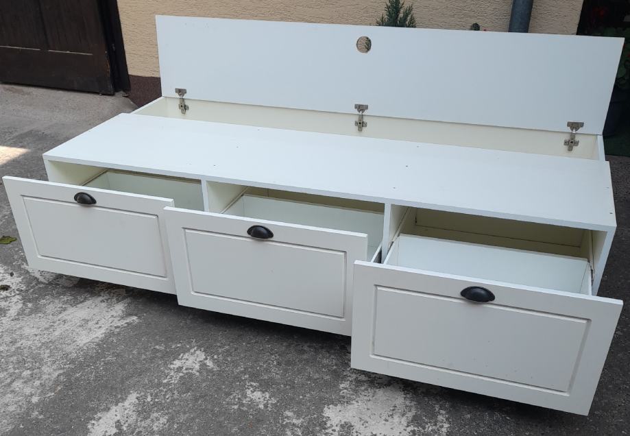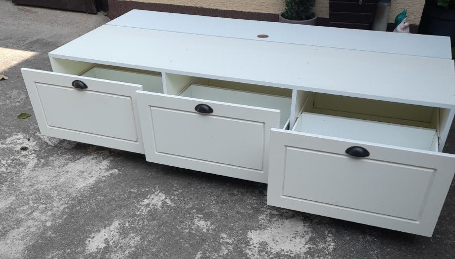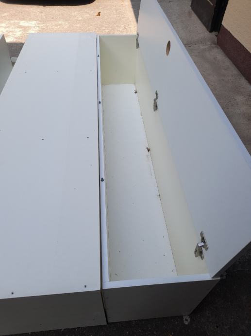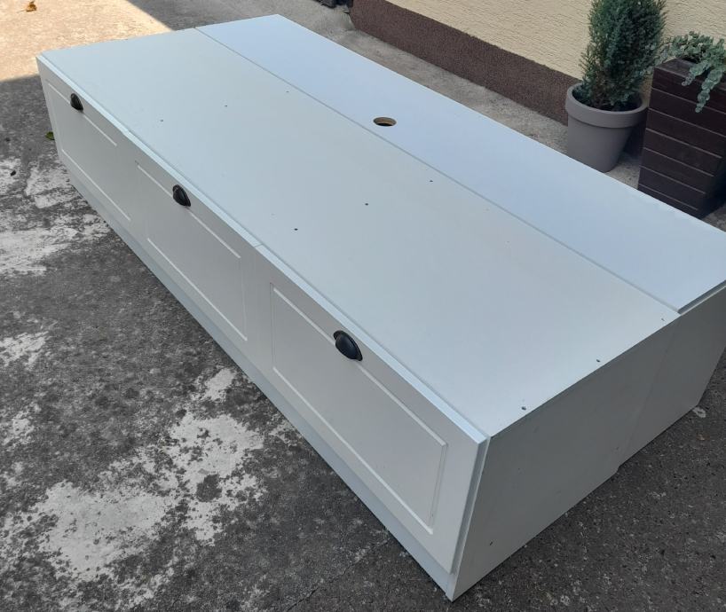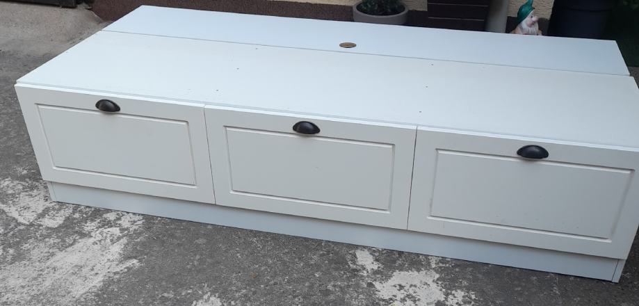 Prodajem nisku komodu-ladicar sa 3 duboke ladice -metaboxi sa kočnicom, iz dva dijela, prednji dio ladice za igracke u djecijoj sobi ili za cipele u hodniku ili ostavi a zadnji dio koji može biti posebno za posteljinu, dimenzije su širina 189 cm visina 45 cm a dubina oba elementa 87 cm, gore može biti spužva, na zadnje 2 slike vidite kako je bilo u stanu u dijelu zatvorenog balkona, ako stavite madrac mozete ju koristiti kao lezaj cijena 90 €, inf na tel 035 260 202, osobno preuzimanje na adresi
