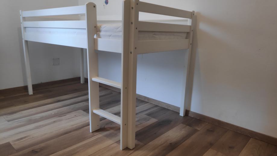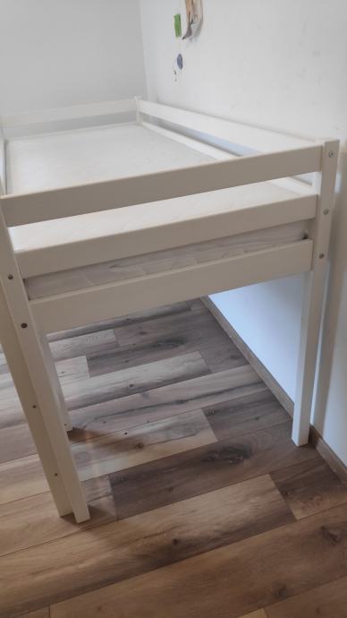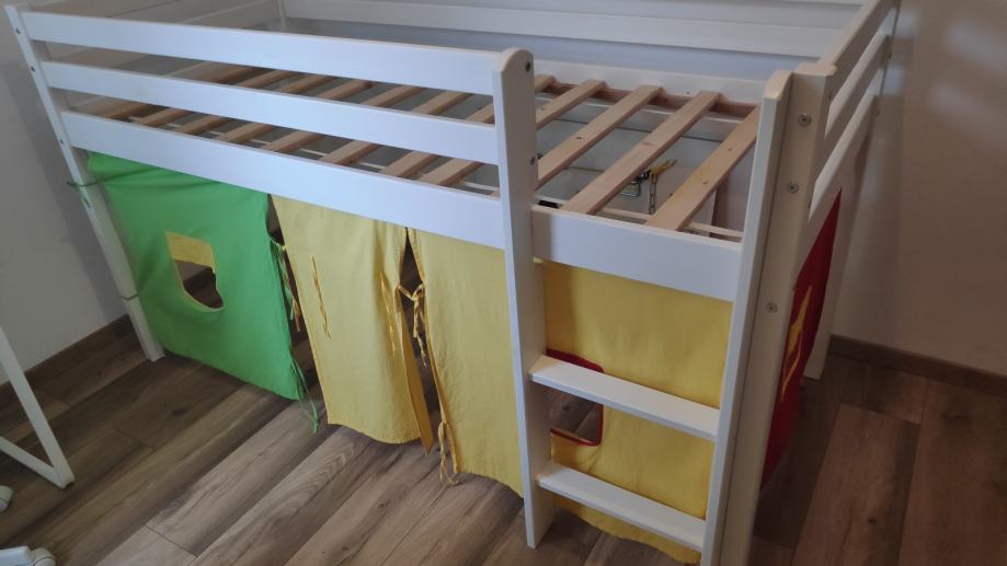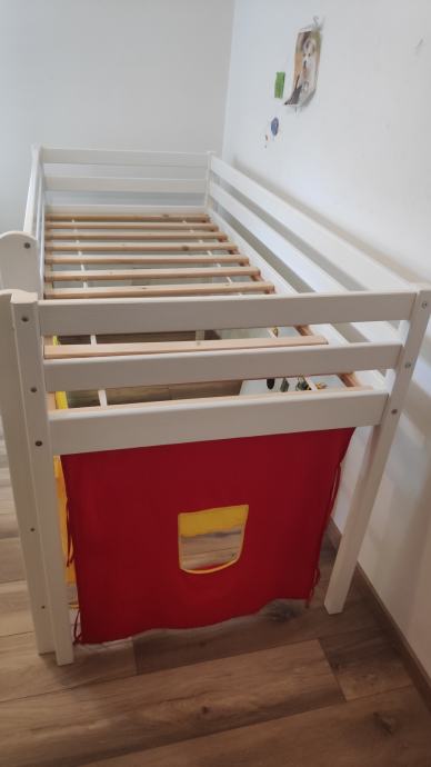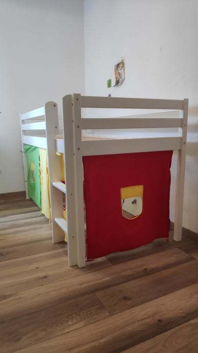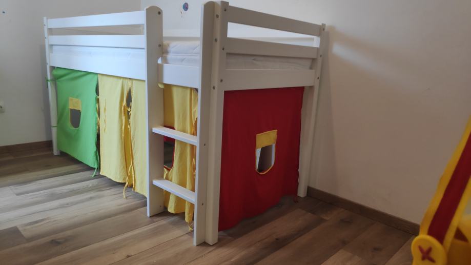 Povišen dječji krevetić madracem u odličnom stanju. Ima zavjese za izgled kućice.