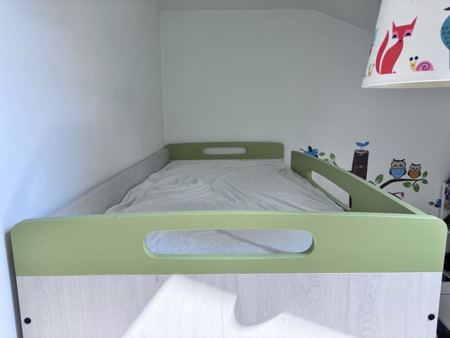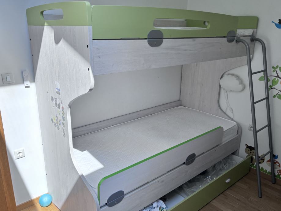 Prodajem krevet na kat kupljen u Prima namještaj 2020. godine. Krevet je malo korišten, pogotovo gornji dio. Dimenzije madraca su 200 x 90 x 22 cm (d x š x v). Vanjske dimenzije kreveta su 206 x 96 x 182 cm (d x š x v). Ispod donjeg madraca nalazi se ladica na izvlačenje po cijeloj širini za posteljinu i sl. stvari. Podnice, metalne ljestve i ogradice oba kreveta su u kompletu.
